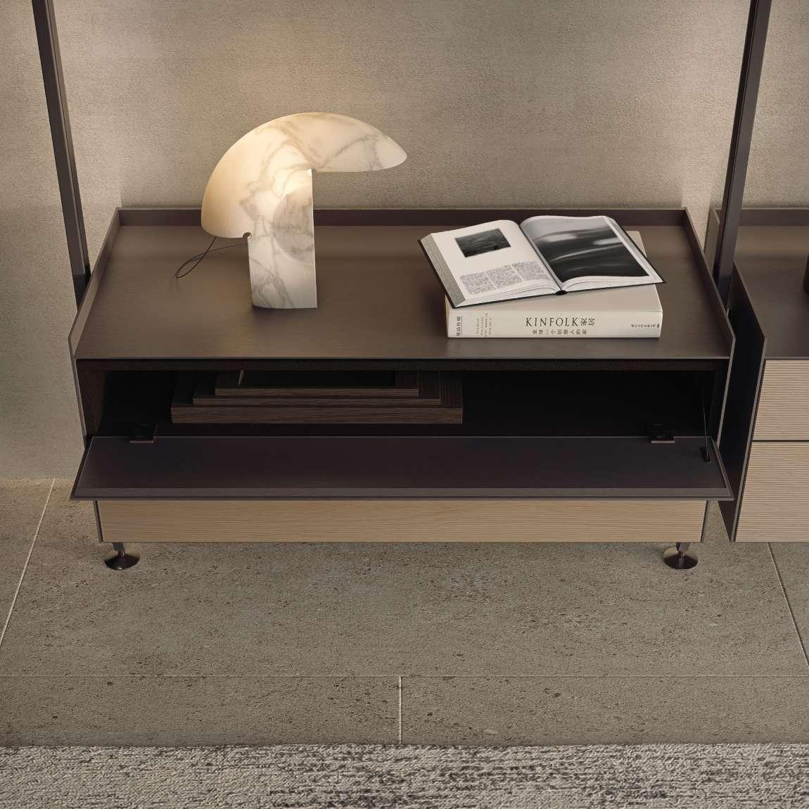 EN In the bookcase version, Zenit now expands its design potential with the introduction of a brand new backlit upright and new suspended units which, like all Zenit facilities, can be freely positioned. The new design includes a chest of drawers, a unit with doors, a chest of drawers with bottom-hinged frame. With their fully extractable runners, the aluminium drawers are also new and come equipped with a unique push opening system and soft-closing mechanism. The drawer and door coating is available in glossy, opaque, reflex, sahara, diamond lacquered glass or in Litech or Sahara and Taiga essence with three-dimensional effect, for a total of 161 finishes. The unit D 340 with bottom-hinged frame is lined inside with synthetic leather in 7 available finishes: Arena, Nube, Argilla, Castoro, Rubens, Etna and Agata