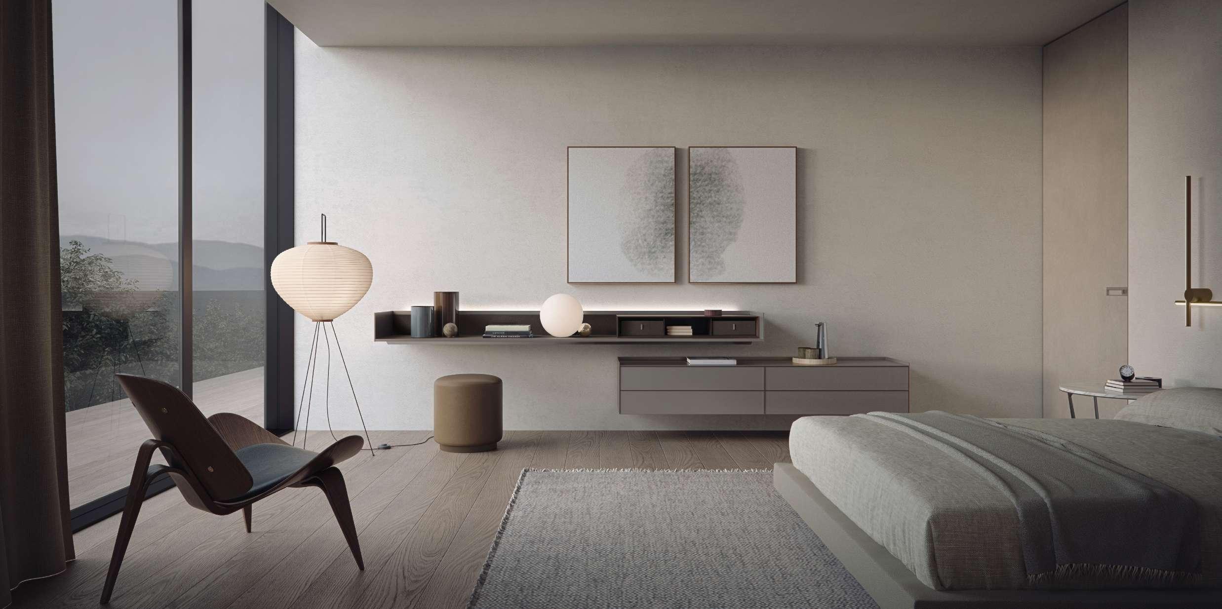 STRUCTURE SUGGESTS A DIFFERENT WAY OF EXPERIENCING NIGHT SPACES. ESSENTIAL AND DISCREET, TWO PLANET LOW TABLES SERVE THE BED, WHILE THE RADIUS DOORS IN THE SYNTHETIC LEATHER VERSION CONNECT THE SPACE TO THE WARDROBE AREA. TOGETHER WITH THE SPECIFIC FUNCTION, EACH PIECE OF FURNITURE HELPS TO CREATE A COHESIVE