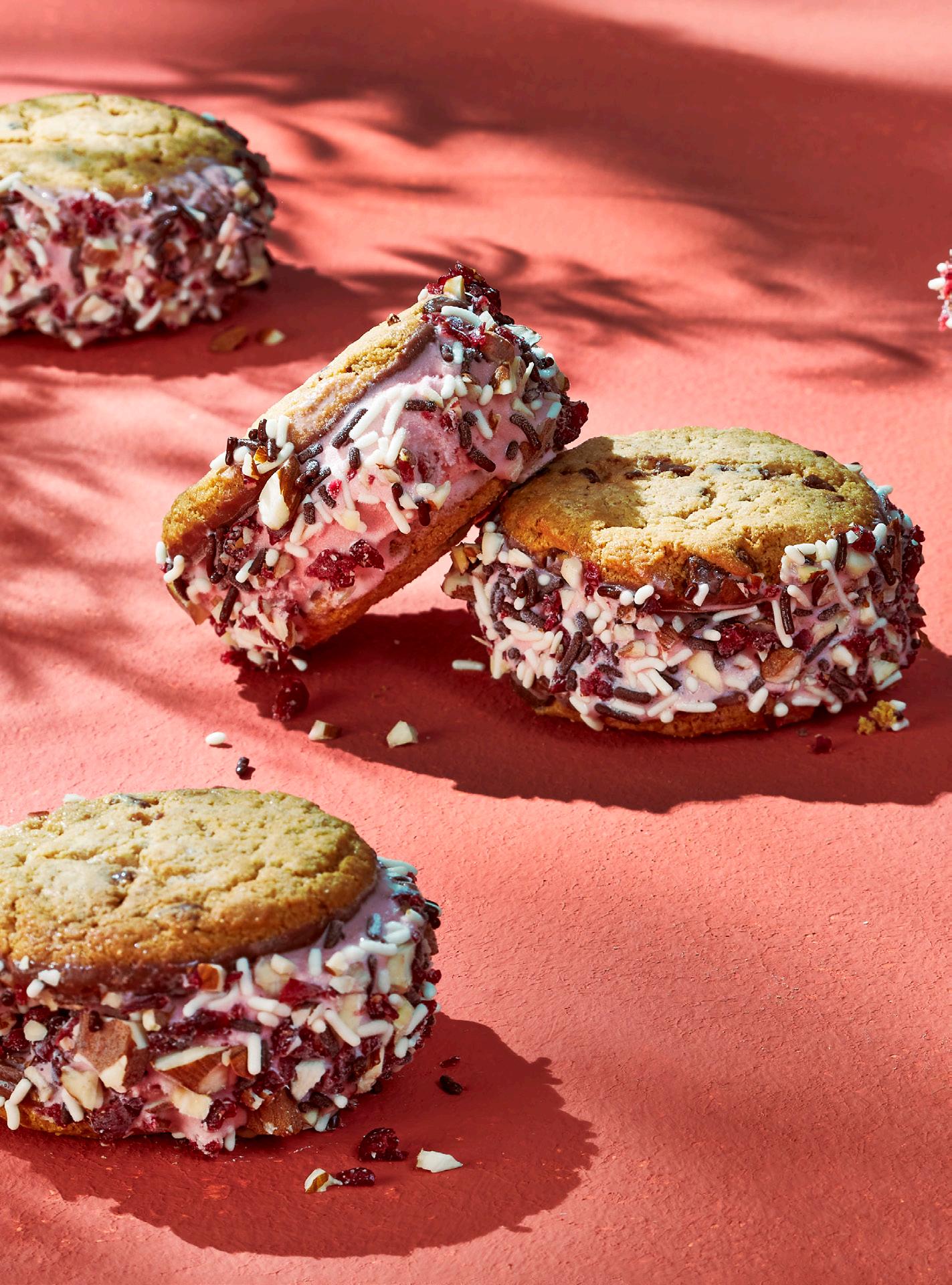 1 Hak de cranberry’s en amandelen fijn. Schep op elk koekje een bol aardbeienijs, leg er een 2e koekje op en druk een beetje aan.