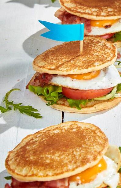 2 Verwarm intussen de pancakes volgens de aanwijzingen op de verpakking. Beleg 4 pancakes met een handje sla, leg de tomaat erop, vervolgens het ei en tot slot het spek. Dek af met de rest van de pancakes en steek vast met een prikker.