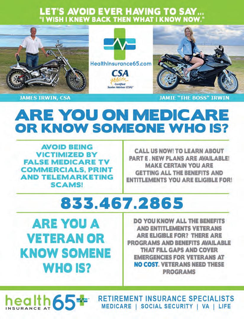 James Irwin www.healthinsurance65.com 888.467.2865 “IT’S A WAY TO GIVE BACK TO THE COMMUNITY I LOVE.” Call 833.467.2865 Bi-monthly Money School 20 min. Webinars at Healthinsurance65.com