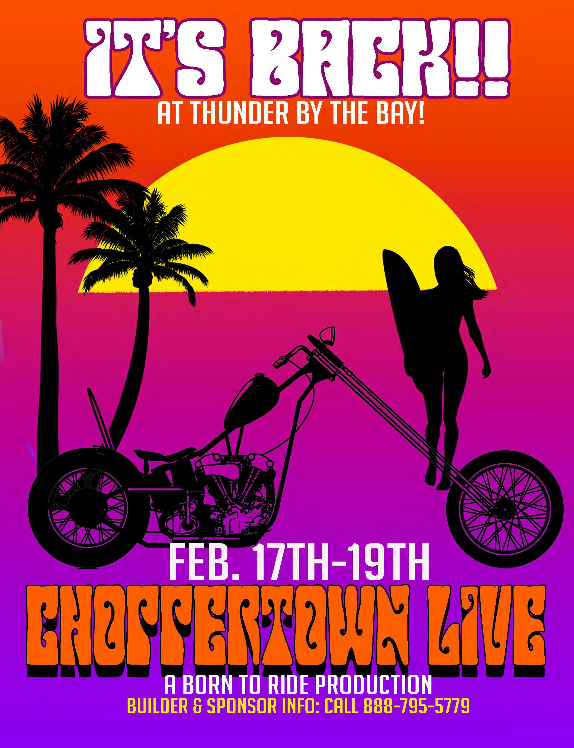 If you’re part of the motorcycle industry, don’t forget to support Born To Ride so we can keep bringing bikers the best of the two-wheeled world. Your support of print media will generate major traffic to your business and help to promote riding. Help us get more new riders on the roads of America. And you bikers out there be sure to join our Born To Ride Facebook Group to keep in touch with likeminded riders and find out about upcoming events. Like what? Well, like Thunder by the Bay. This coming February 17th through the 19th marks the 25th Anniversary of this biker bonanza in beautiful Sarasota. You can bet that Born To Ride will be there to host Choppertown Live once again. It’s the best ride-in chopper show this side of the Mississippi. If you’re there, you might just see your grinnin’ mug right here in Born To Ride!