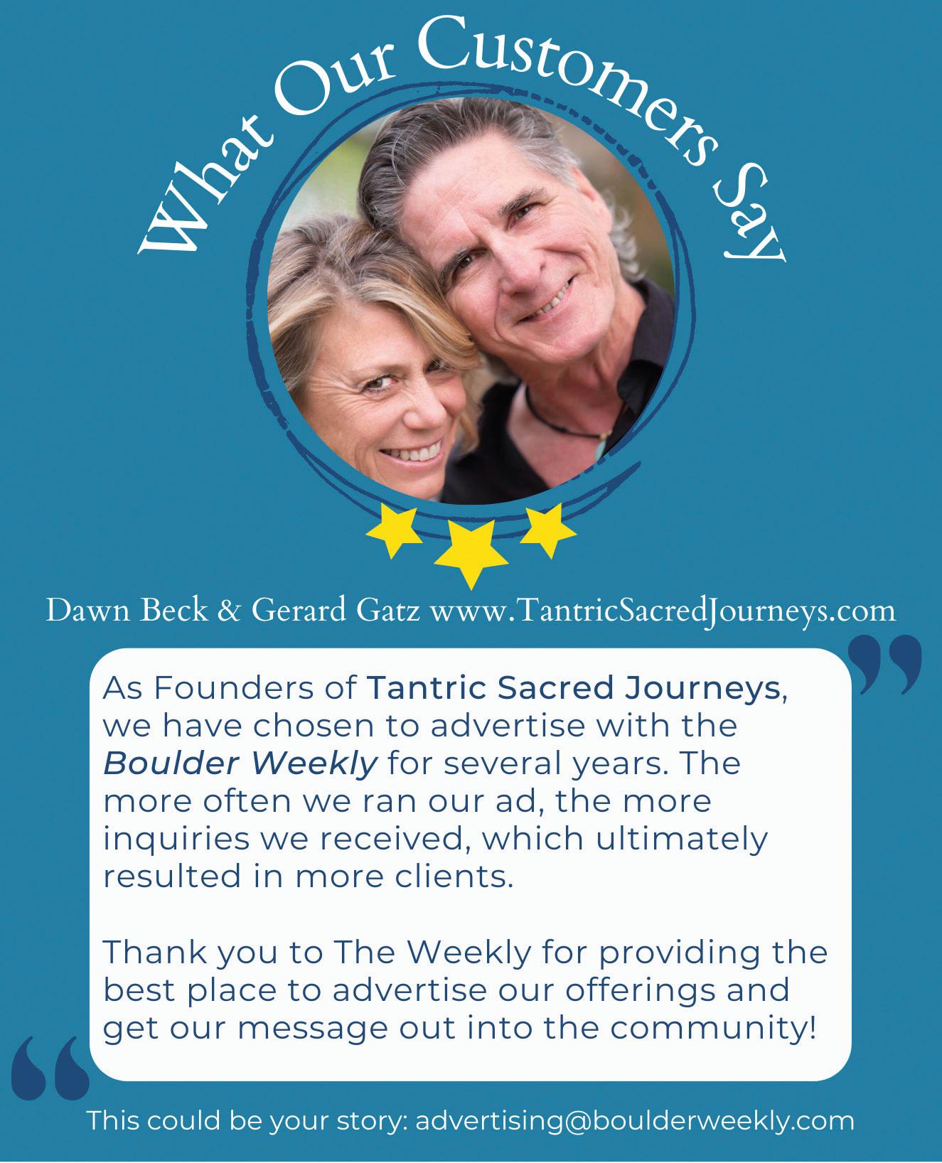 boulderweekly.com STAY CONNECTED Check us out on Facebook and Twitter for events, local news, and ticket giveaways. facebook.com/theboulderweekly twitter.com/boulderweekly Tantric Sacred Sexuality Exploration & Education For more information: 720-333-7978 www.tantricsacredjourneys.com Beginners Weekend for Singles AND Couples May 3 - 5, 2024