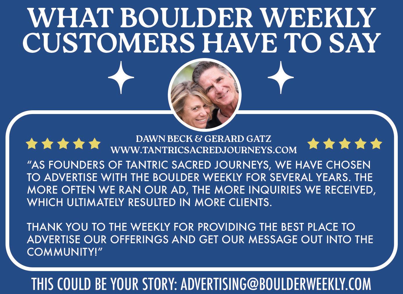 As Boulder County’s only independently owned newspaper, Boulder Weekly is dedicated to illuminating truth, advancing justice and protecting the First Amendment through ethical, no-holds-barred journalism and thought-provoking opinion writing. Free every Thursday since 1993, the Weekly also offers the county’s most comprehensive arts and entertainment coverage. Read the print version, or visit boulderweekly.com. Boulder Weekly does not accept unsolicited editorial submissions. If you’re interested in writing for the paper, please send queries to: editorial@ boulderweekly.com. Any materials sent to Boulder Weekly become the property of the newspaper. 1495 Canyon Boulevard, Suite CO 1, Boulder, CO 80302