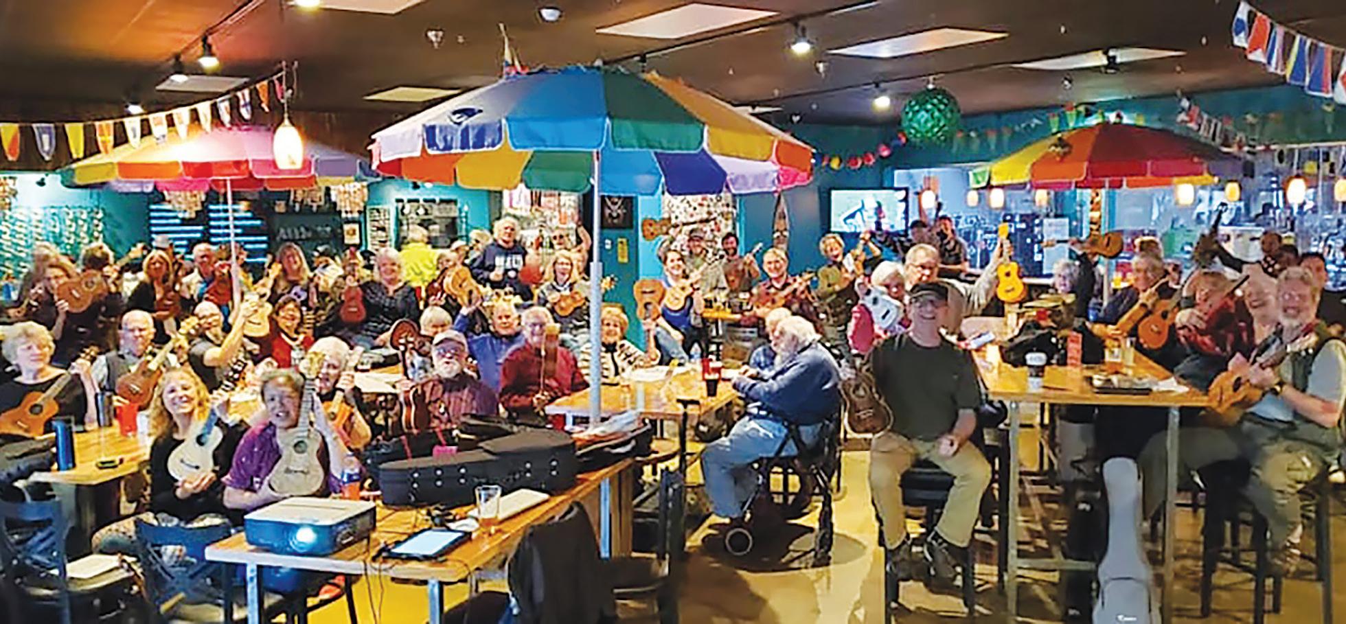 It’s the LoCo ukulele jam, held every Sunday from 2-4 p.m. for the past seven years. Every space in the parking lot car and bike — is full, as is every seat in the bar.