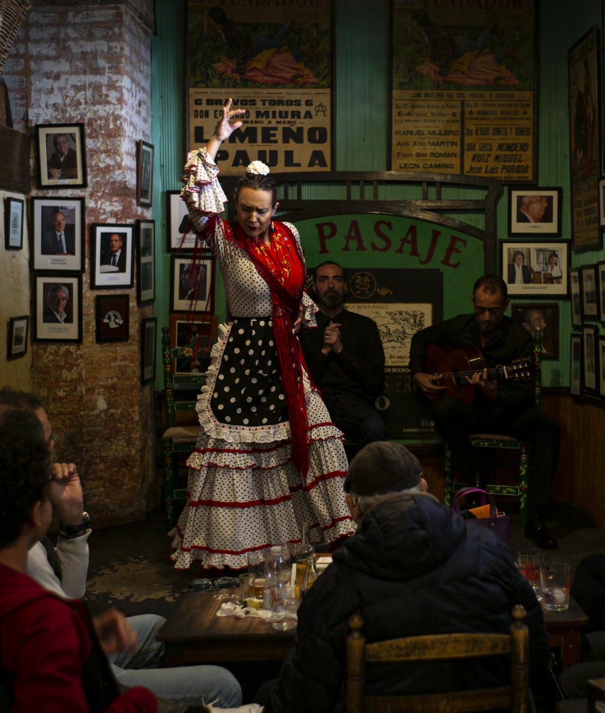 I follow the sounds of people shouting “Olé!” into a little “tablao” (an intimate flamenco venue) called Tabanco El Pasaje, elbow my way up to the bar and quickly utter a few of the Spanish words I know: “Oloroso (sherry), queso (cheese), y aceitunas (olives), por favor.”