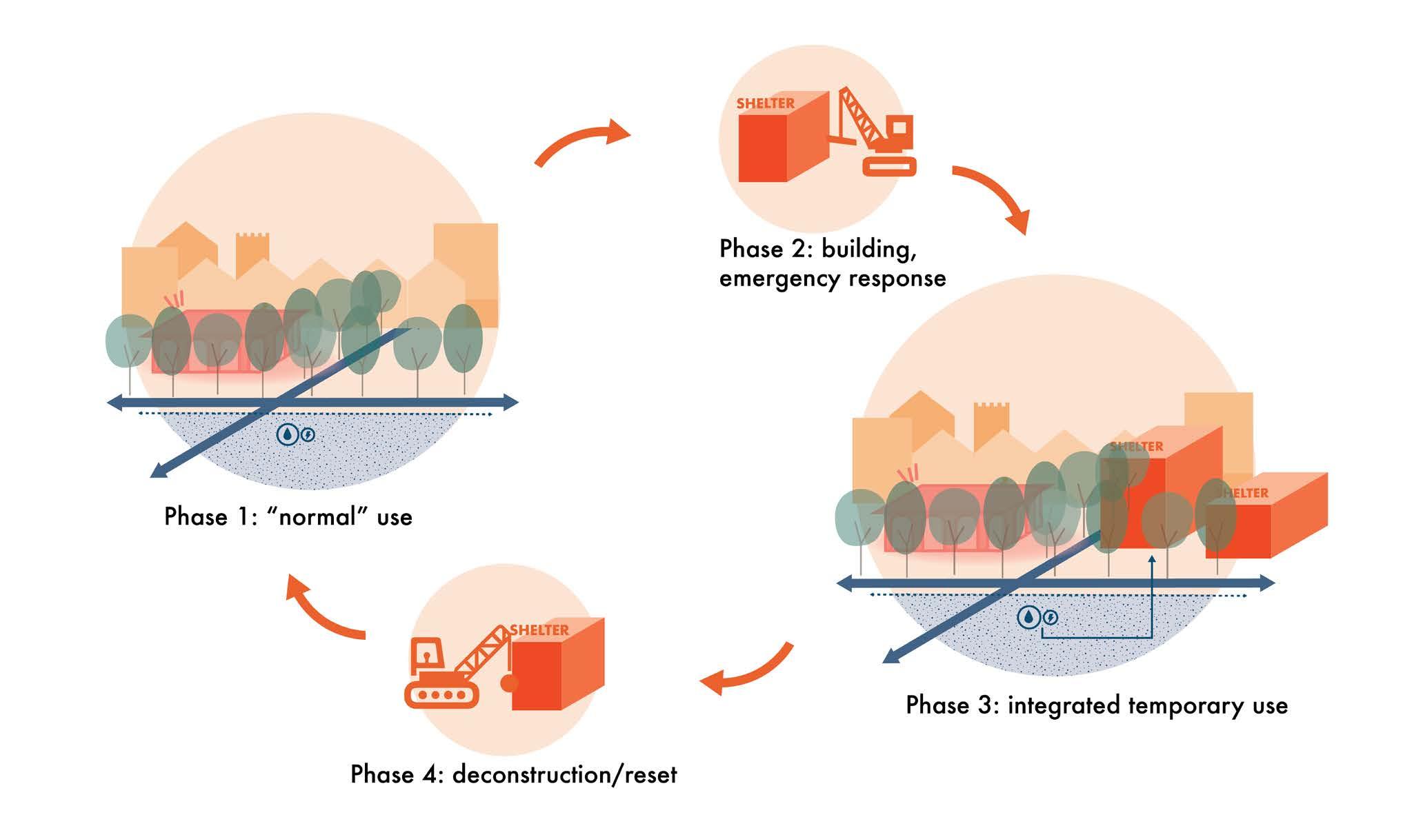 Second, there is an emergency reception, which addresses the unpredictable nature of the world we live in. Influxes of people, caused by conflict, environmental disaster, or other crises, cannot be fully predicted. Here lies the most significant potential for social and economic gain. Qualitatively, public space is challenging to realise under current housing pressure, yet they are vital for physical and mental wellbeing. By designing them with flexibility, they can serve a dual purpose: in everyday life, they provide high-quality leisure space, and in times of need, they can temporarily host an emergency shelter. This is not only more humane but also far more cost-efficient. Today, emergency shelter depends on hotels, recreational parks, or boats that charge exorbitant rates; for example, the Galaxy boat in Amsterdam costs €110,000 per day, while offering poor living conditions. Preparing spaces in advance would save millions in the long term. These prepared spaces provide humane living conditions at a fraction of the cost, while 80–90% of the time functioning as high-quality public amenities for all residents.