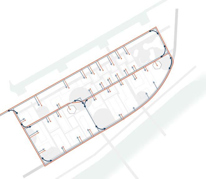 The infrastructure is vital for responding to the need for emergency shelter quickly. A well-divided network of paths allows the trucks to load the units or other machinery to enter the park without damaging it. The routes for trucks are made with the correct curve radius so they can easily navigate through the park. Under this network, electricity and water are already established, so in times of need, the units can be easily set up and connected to utilities. It is a costly intervention, but in the long term, it will save a lot of money.