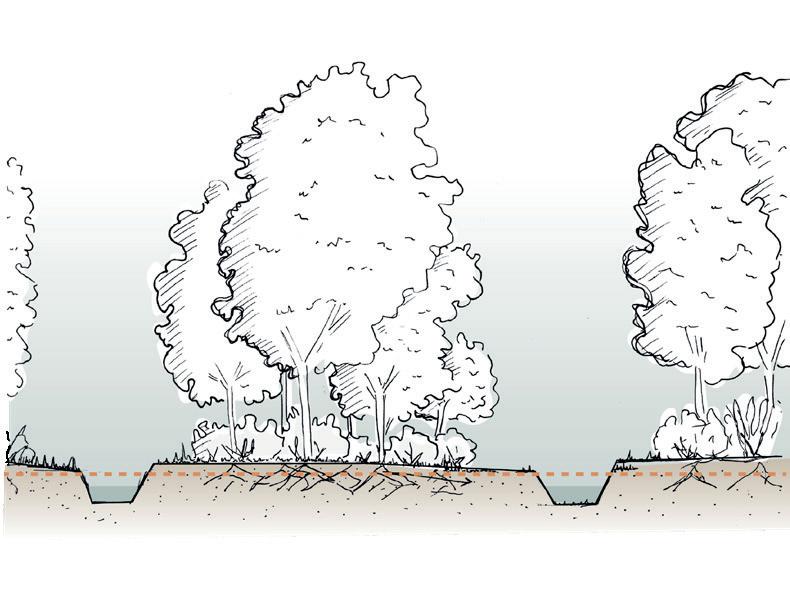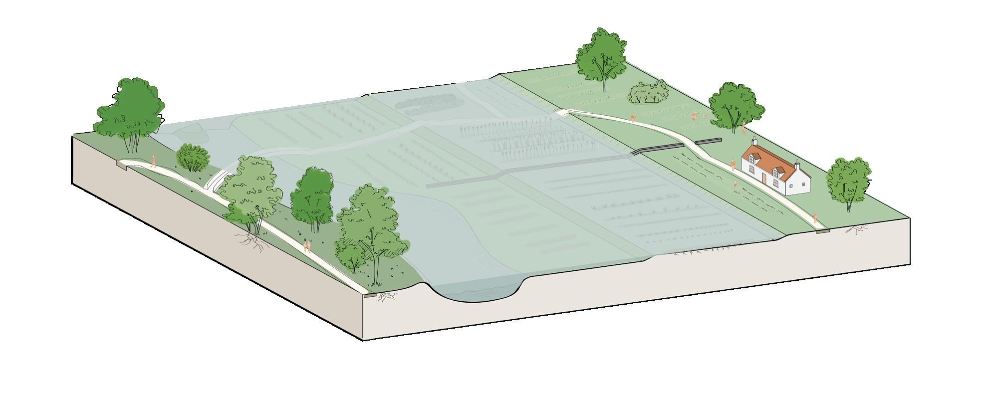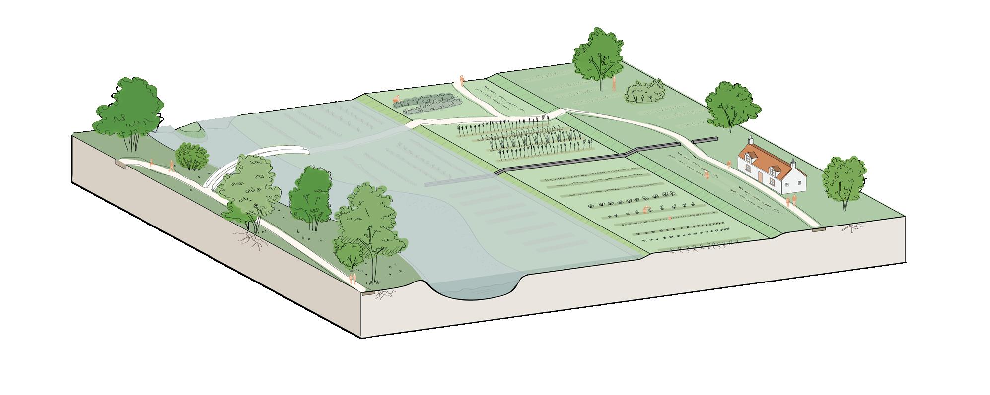 By establishing a water structure that directs the waterflow during flooding and protects the raised forest beds, the forest crofts form another link to the water entering the firth. The added elevation controls drainage.