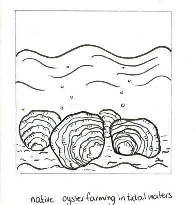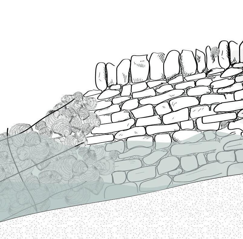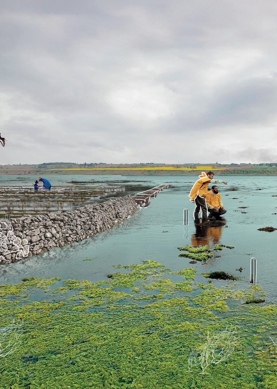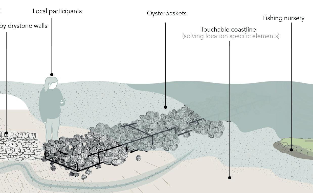 Harsh boarders are softened, creating space for the firth to breath. This intertidal space provides crofters the opportunity work with the rhythms of the tide. Drystone walls merge seamlessly into oyster baskets to grow native oysters. When the tide recedes, a whole world is revealed. An oyster bench offers a place to sit and gather, a common path that becomes visible, and the richness and beauty of the tidal ecosystem is unveiled. The high and low water continuously play with the elements, ensuring the interaction is different every time.