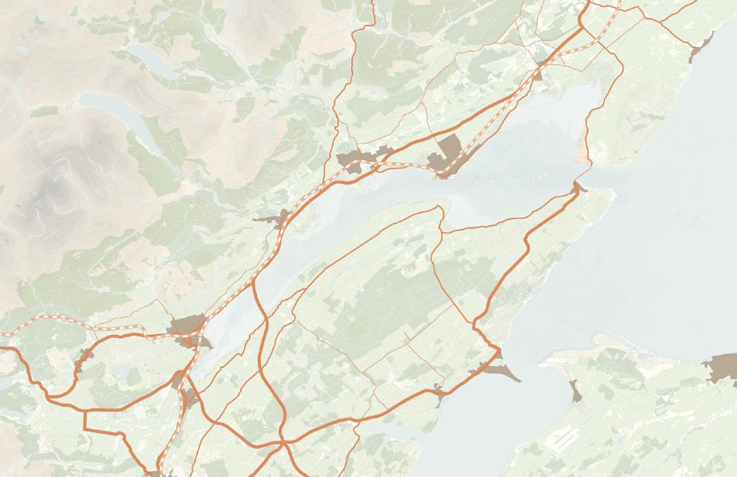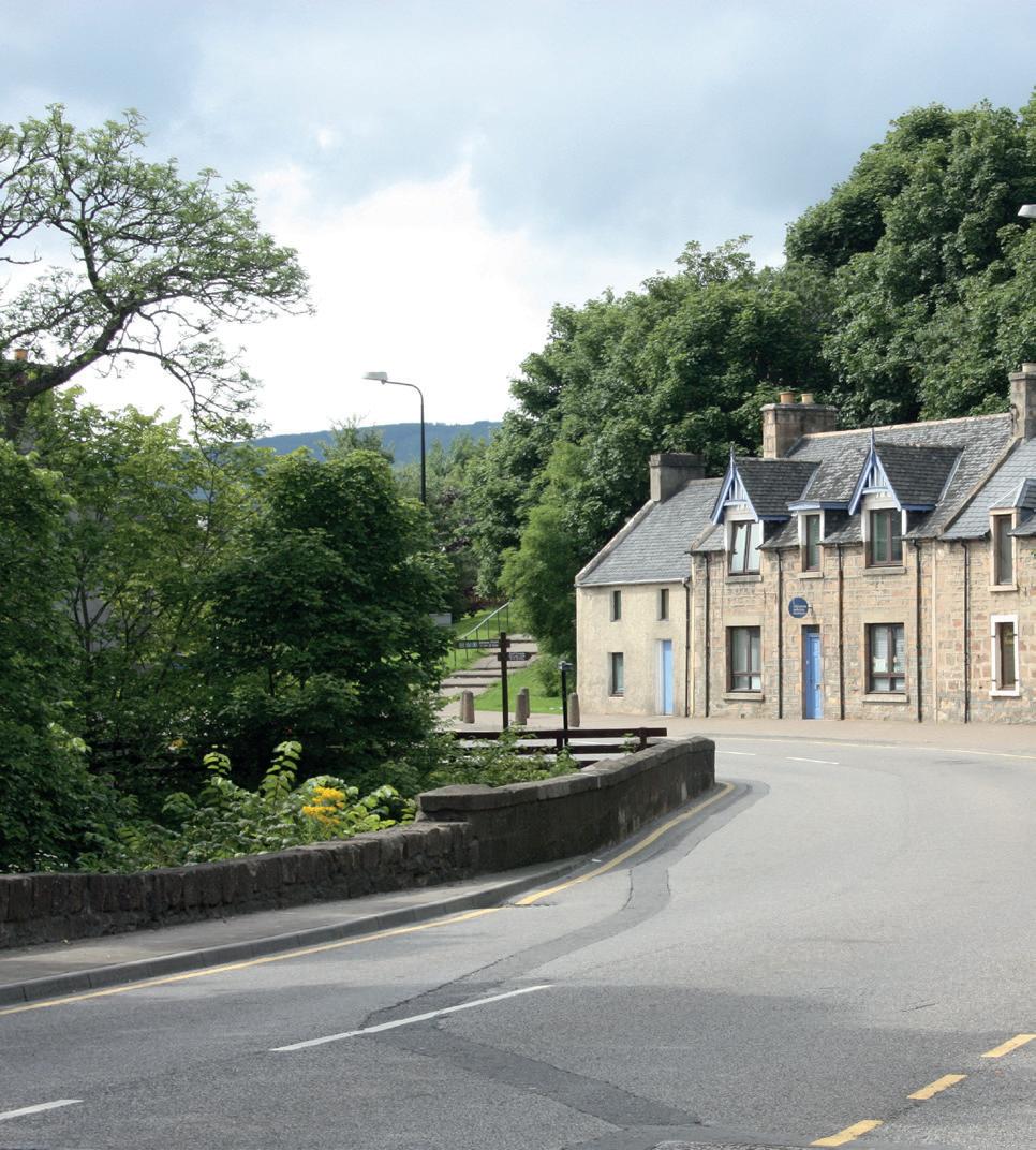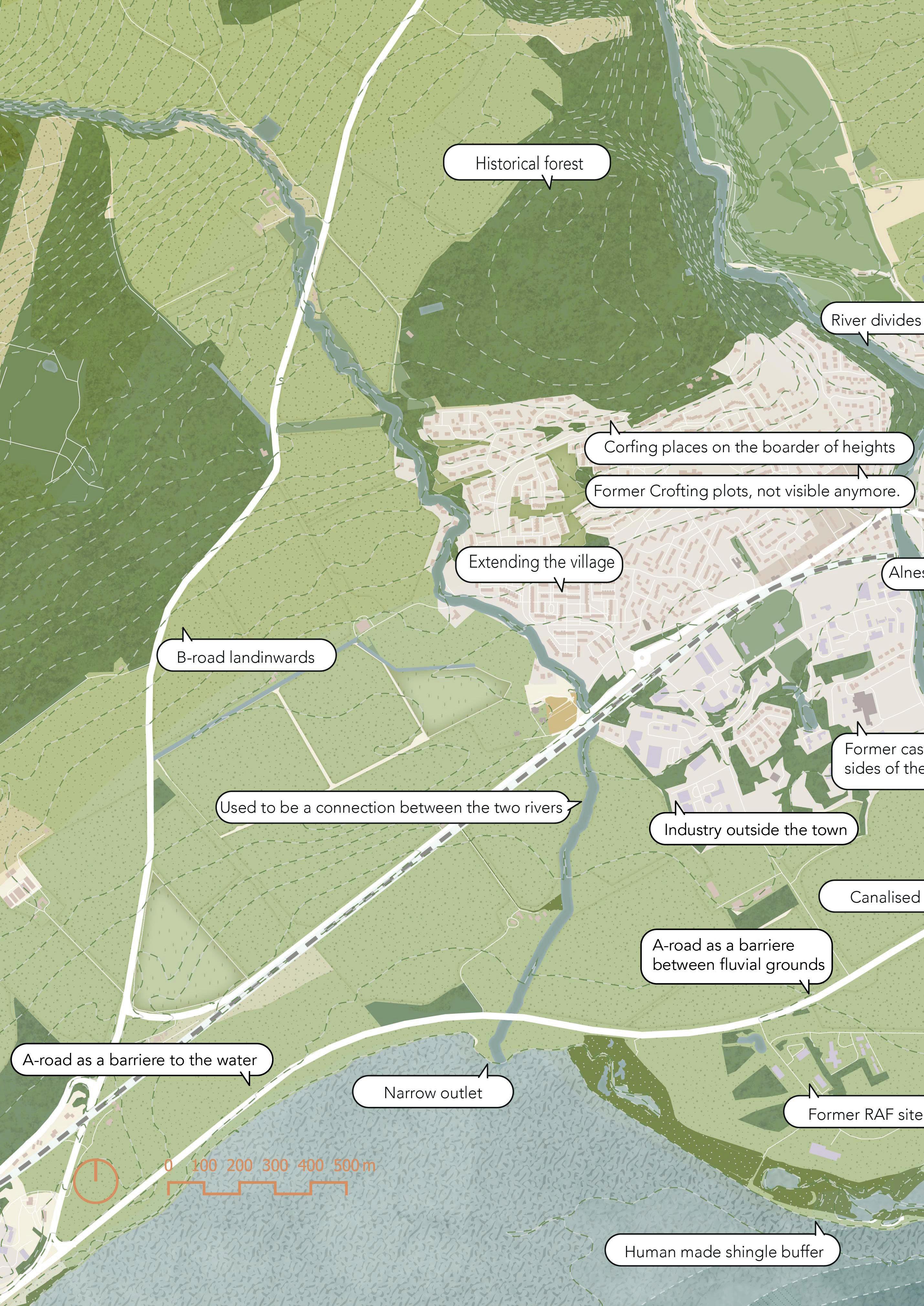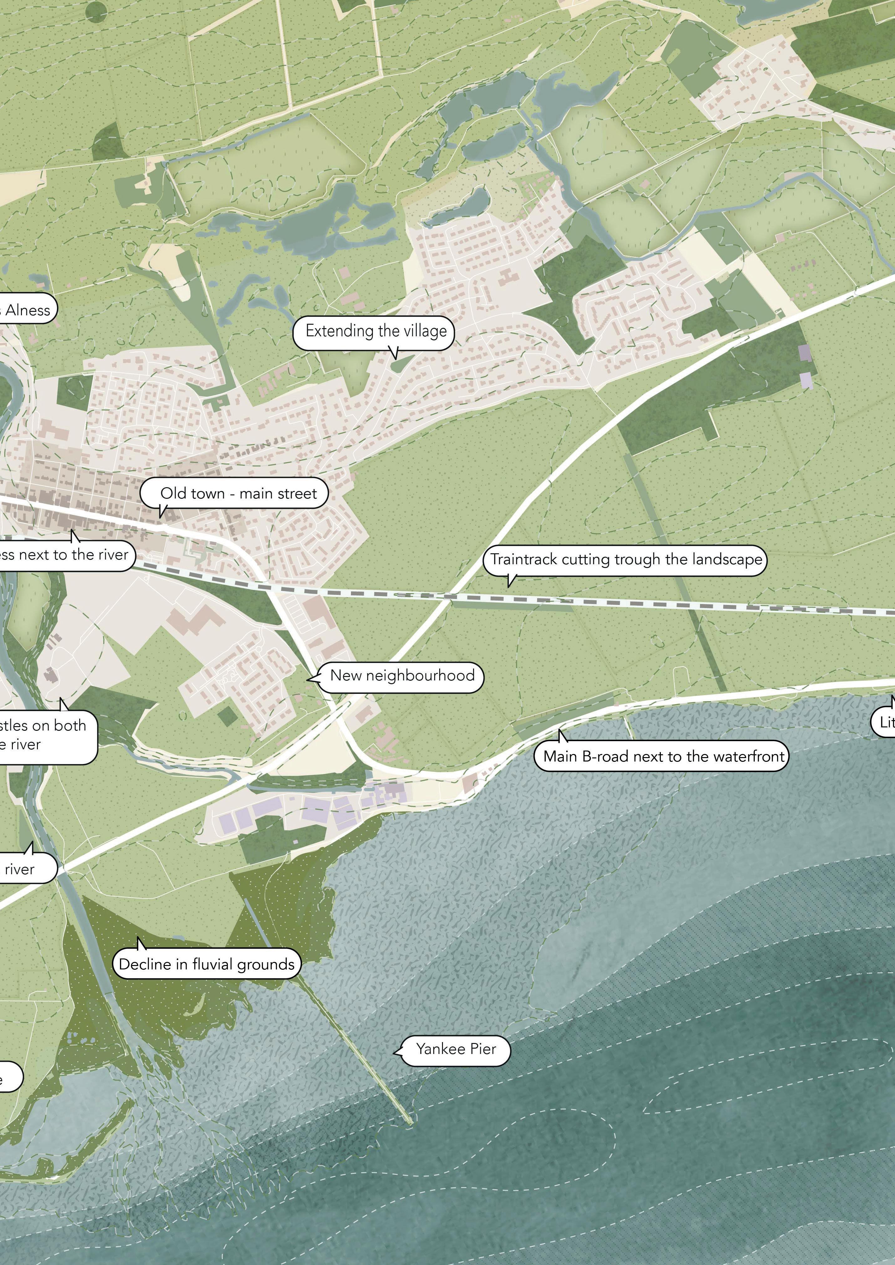 As the town of Alness takes shape, a bridge over the Averon forces the forest and river to part ways. It links both sides of the village, which has expanded over the years. The bridge continues into a road that cuts through the landscape gradient.