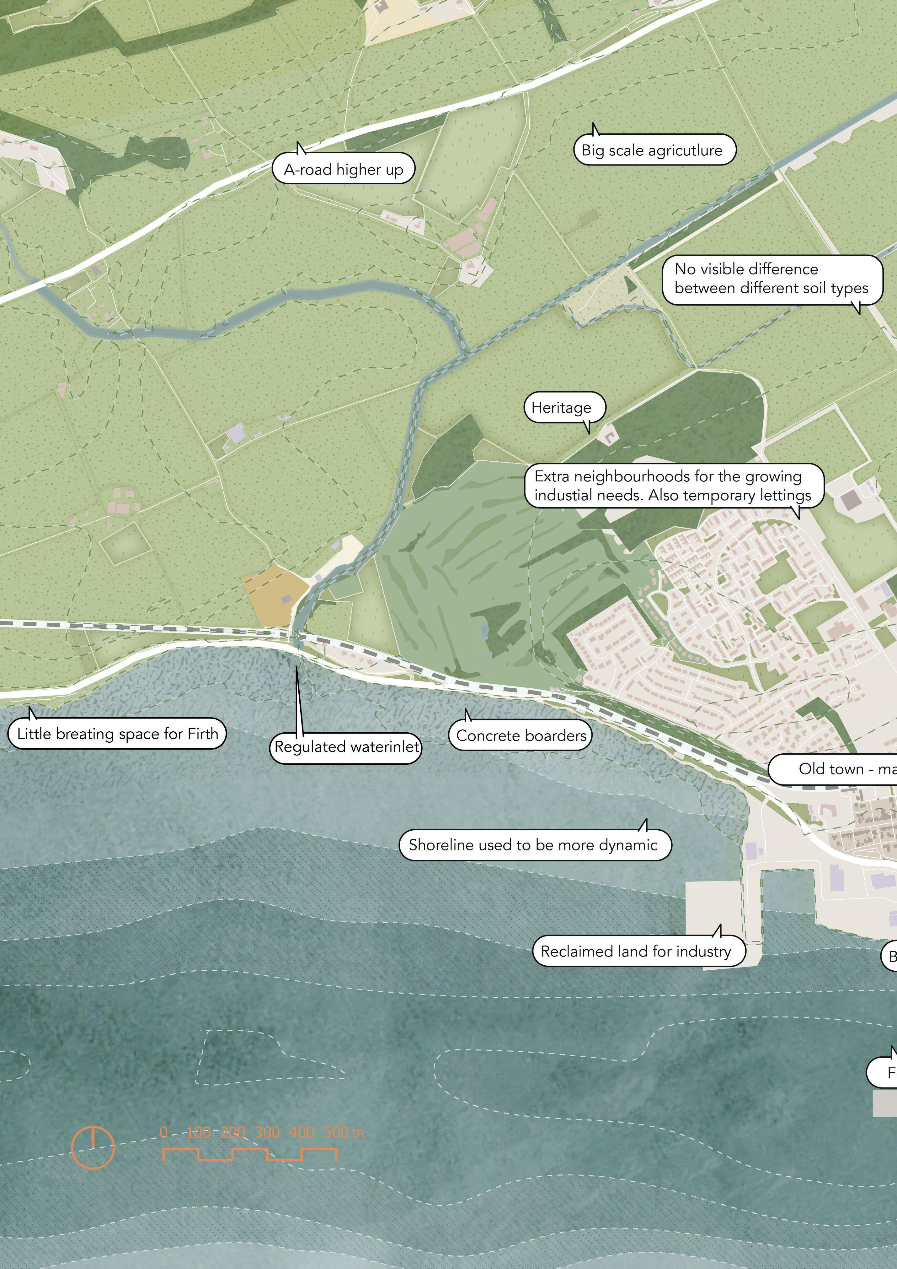 met de hardheid van de grootschaligheid en industrie. De gradiënt in het landschap wordt verstoord door barrières die het gebied doorkruisen. Industrialisatie heeft het water verstijfd en de sociale connectie vertroebeld. Niet langer is de gemeenschap emotioneel en fysiek verbonden met het water. Het contact met de Firth is verloren. Het water van de Firth is in de vergetelheid geraakt.