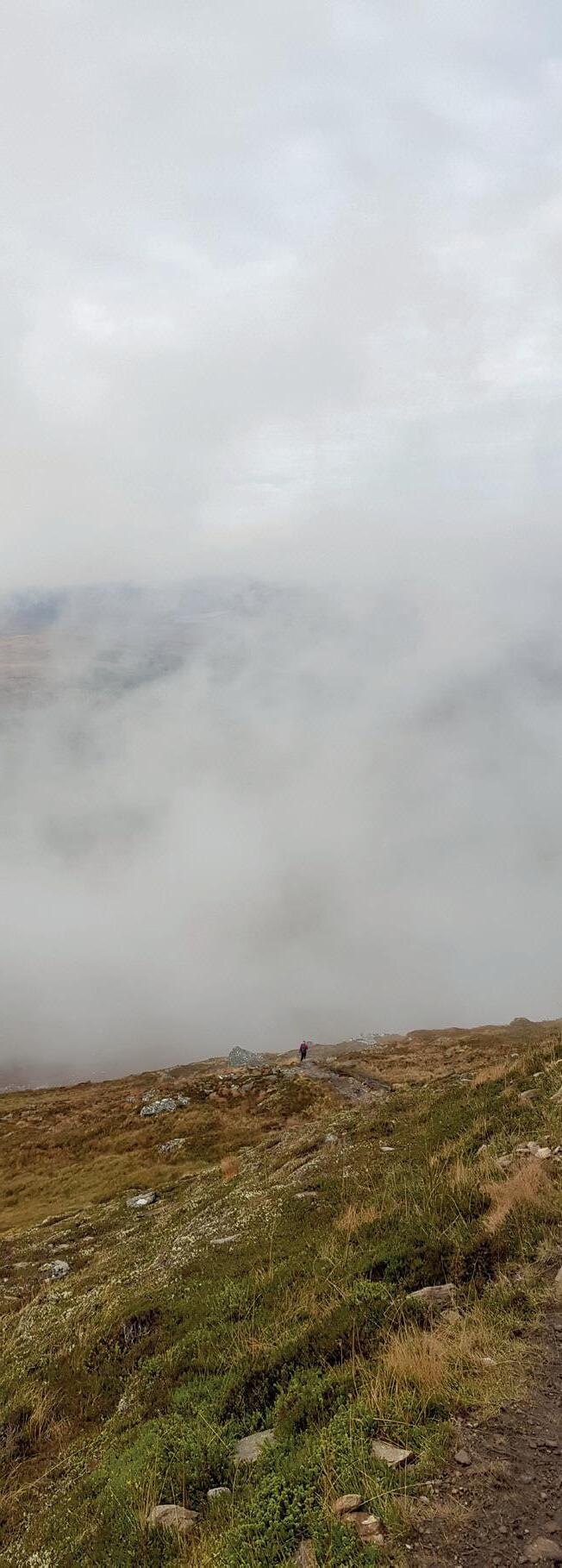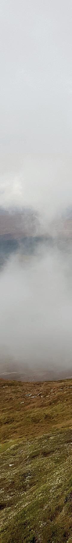 Standing on the peaks of the highlands, the wind rushes past you in an open and robust landscape. The clouds hide and reveal the peaks, traveling along on this high altitude. This combination of elevation and persistent winds contributes to the region’s harsh environmental conditions, defining a mountainous landscape that is typical for the Highlands’ distinct topography. The tops of the Scottish Highlands are characterized by their elevated, rugged terrain.
