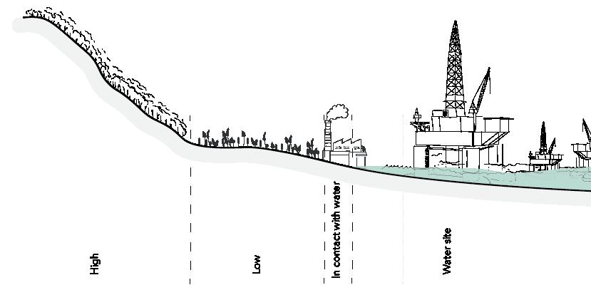 During my site visits, I observed the underlying gradient of the landscape, with its natural contours shaping the terrain beneath my feet. Yet, barriers— both physical and emotional—cut through the landscape, disrupting its continuity. The tidal zones, once intimately tied to the land, now feel distant and severed from their original connection. Scattered relicts from a time when the relationship with the land was stronger are now overshadowed by the imposing presence of the oil rigs.