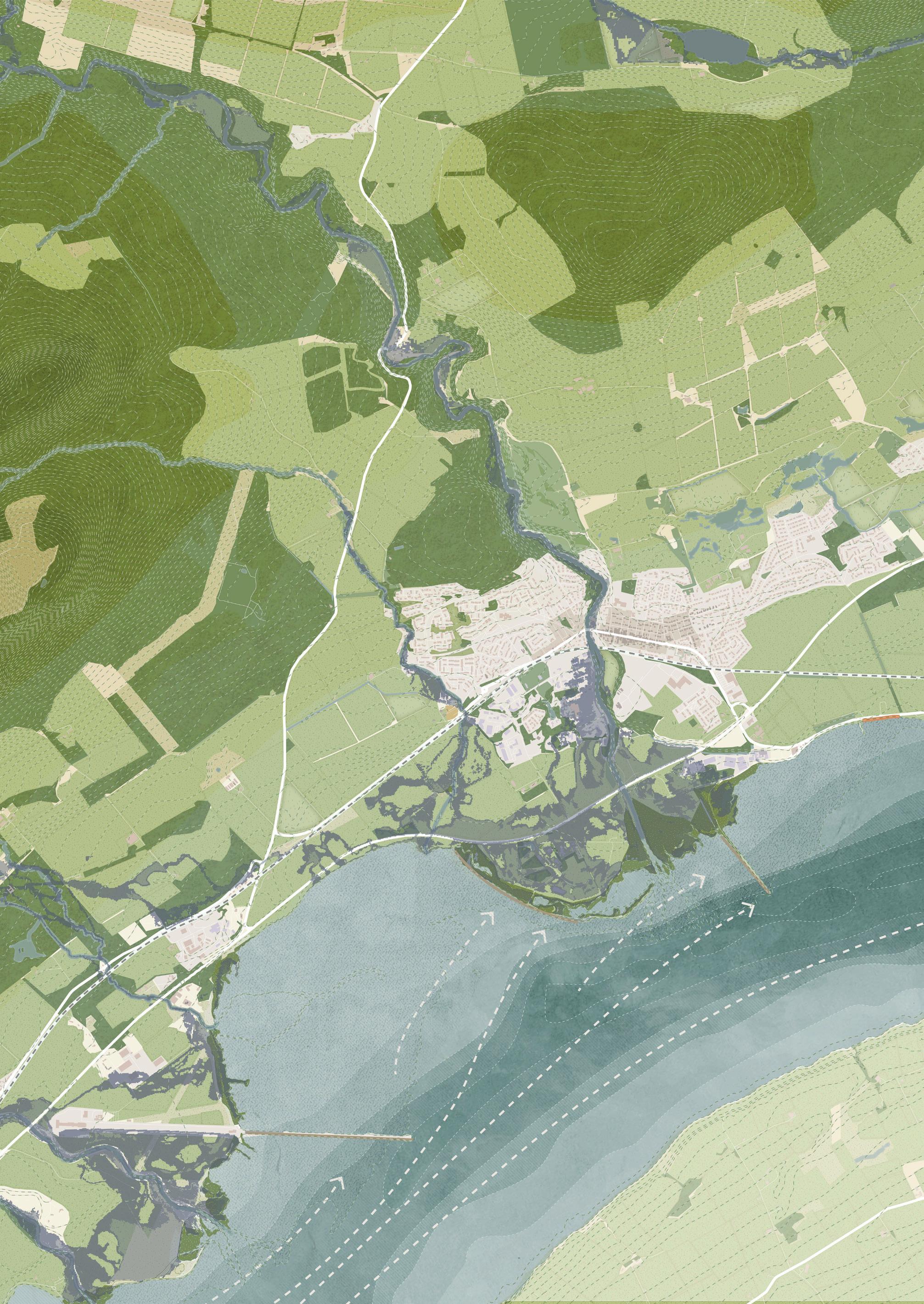 The river Averon has been tamed and channelised. Its once wild course is now straightened, its banks tiered and paths form walls, guiding the water towards the river mouth through engineered fish traps.