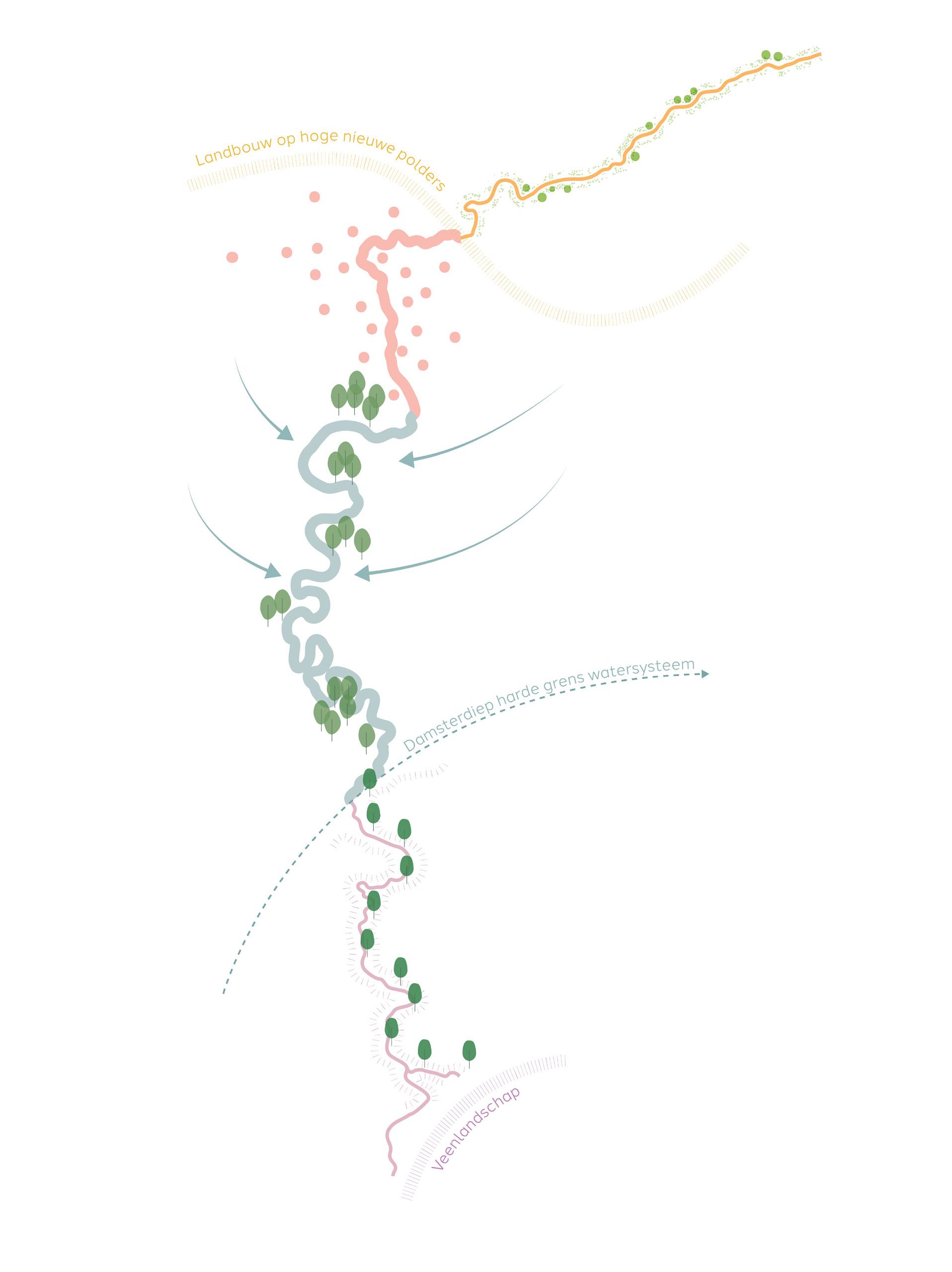In het omliggende landschap kunnen de bestaande laagtes en sloten ingezet worden voor extra opvang en watertoevoer.