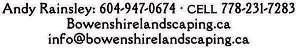 Share the love, send us your fave holiday recipe email to Alex editor@bowenislandundercurrent.com 604-987-7663 BOWENISLAND ROOFING ROOFING&REPAIRS Trade ticket certified #00012 RO 96 Tim Rhodes REALTOR® 604.341.9488 RHODES ON BOWEN REAL ESTATE MARKETING going that extra mile rhodesonbowen.com tim@rhodesonbowen.com RoB WWW WHITEHART CA ADDRESS 302-566 ARTISAN LANE BOWEN ISLAND, BC PHONE 1 (778) 999-3434 BUILT GREEN BC BUILDER NEW CONSTRUCTION RENOVATIONS RESTORATION ADDITIONS SECONDARY STRUCTURES UNIQUE OUTDOOR SPACES SUB CONTRACT WORK CONTACT US FOR A FREE QUOTATION • Irrigation • Landscape Lighting • Hydroseeding Office: 604 947 9686 Call now for Landscape Lighting Services and Installations Window Blinds On Bowen 778-995-1902 &AWNINGS &AWNINGS 604-785-0990 Charmaine Heffelfinger Cheffelfinger@budgetblinds.com On Bowen serving Sea to Sky II I&I TOWING HAULING LTD Vehicles • Construction Equipment Sea-Can Containers • Tiny Homes Bowen Island • Greater Vancouver Vancouver Island • Sunshine Coast Michael Bingham • 604 947 1717 ianditowhaul@gmail.com BOWEN HOME SERVICES love the life you live bowenislandundercurrent com • A15 Thursday, December 8, 2022