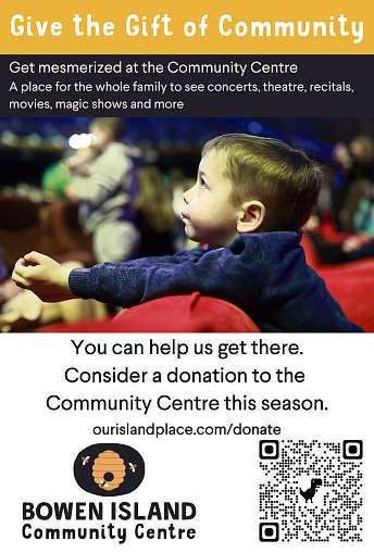 Having an event? Listings are always free in our weekly community calendar Please email your listing to Alex by Tuesday 5 p m for that week's edition editor@bowenislandundercurrent com Thank you! bowenislandundercurrent.com • A11 Thursday, December 8, 2022