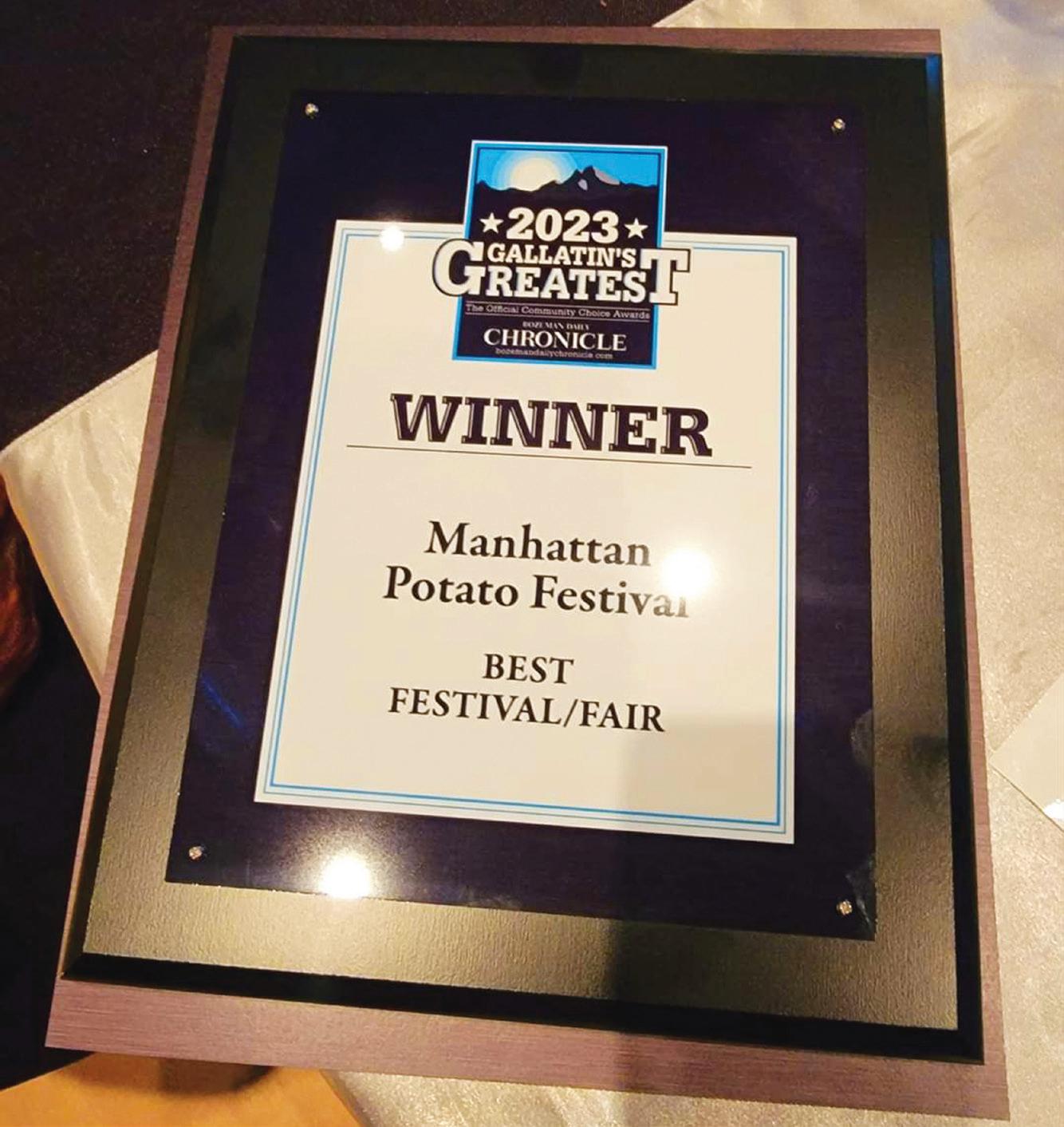 Organizers of the Manhattan Potato Festival are humbled and grateful to have been chosen as Gallatin’s Greatest Festival in 2023. We couldn’t do what we do without our amazing sponsors, vendors, festival-goers, volunteers, local businesses, churches and organizations, law enforcement, public works, “roadies”, the Town of Manhattan, MT Department of Transportation, and last but not least our families and friends who support us in this wonderful madness! It is said that it takes a village to throw SpudFest... wait, that’s not how the saying goes, but we like it! Thank you, Manhattan... and thank you for the repeat nominations for 2024 in the Best Festival and Best Event Categories. You really know how to make us feel special! The Manhattan/Churchill/Amsterdam community and the love of our agricultural heritage are why we keep doing what we do. Long live SpudFest!