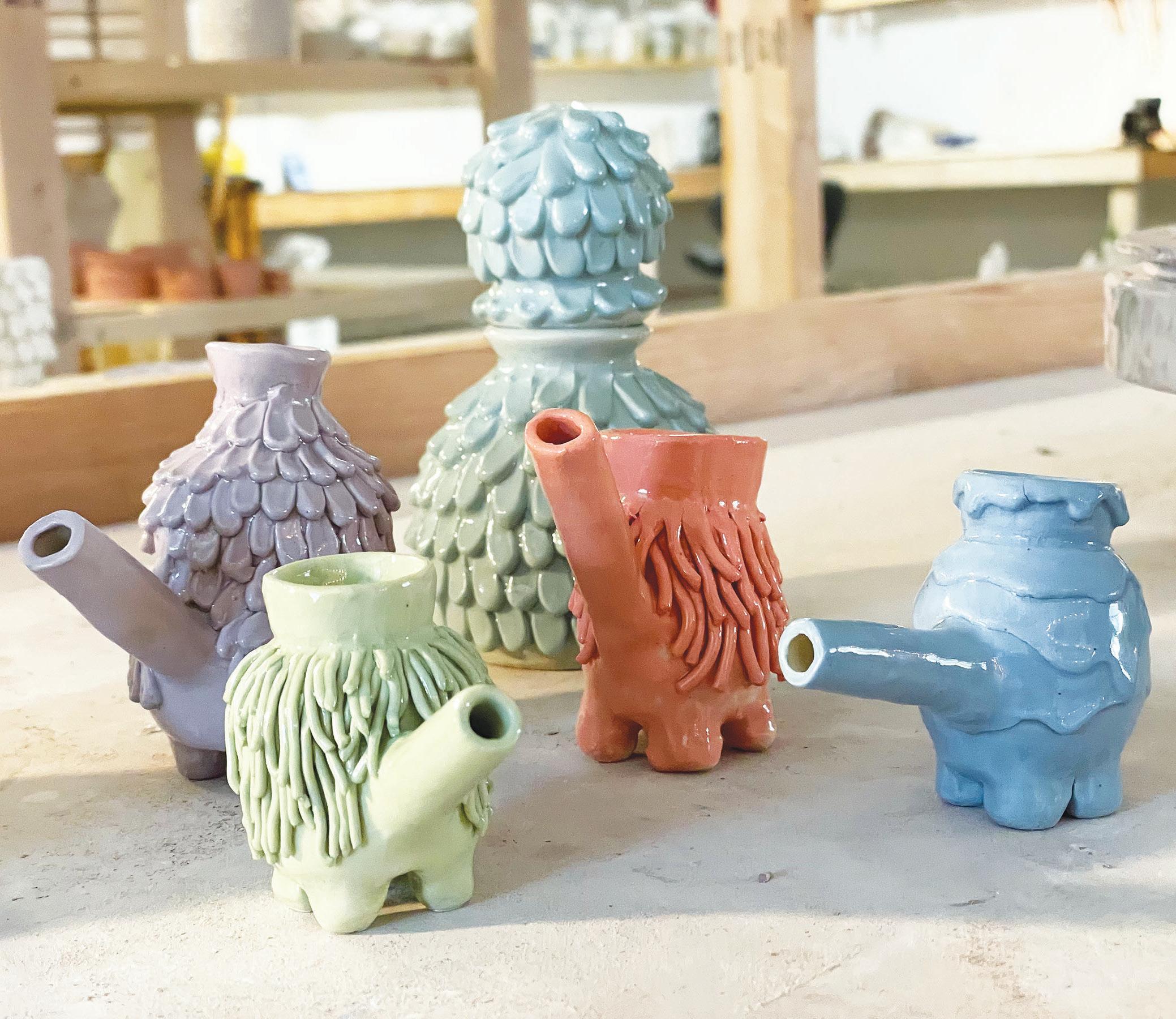 On the Fitteramics Instagram page (https://www.instagram.com/ fitteramics/), Fitterman often adds faces, gifs of eyes, arms and mouths to her creations, anthropomorphizing the already character-like pieces like “critter hitter” pipes, mugs and chess sets.