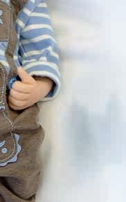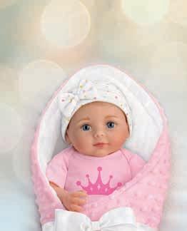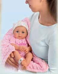 Cette poupée bébé articulée séduit par sa peau en vinyl plus vraie que nature. Ses joues jou ues, ses bras et ses jambes mignons sont peints à la main tandis que ses cheveux sont soigneusement enracinés à la main. Grâce à son corps en tissu au poids réaliste, elle vous donne l’impression de tenir un vrai bébé dans vos bras. Son set de 7 pièces comprend une grenouillère, un bonnet assorti, une couverture douillette avec un nœud, une boîte de collection ainsi qu’un bracelet d’hôpital personnalisable et un certi cat de naissance. Taille : 40,6 cm N° d’article : 03-02859-001 • € 99,90 (payable également en 2 mensualités de € 49,95) plus € 9,95 expédition et service