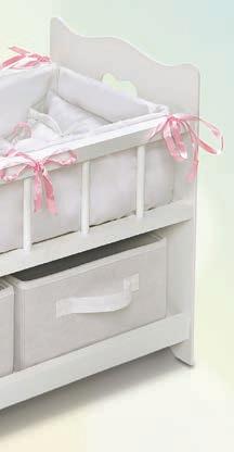 Wenn Sie Ihre süße Babypuppe zum Schlafen legen, warum ihr dann nicht den ultimativen Komfort und ein Hauch von Luxus gönnen? Das Bettchen verfügt über zwei herausnehmbare Aufbewahrungskörbe – ideal, um Puppenzubehör sicher und gri bereit zu verstauen. Innen ist es mit einer weißen Polsterung ausgekleidet und wird inklusive eines luxuriösen Kissensets für noch mehr Komfort geliefert. Herz-Ausschnitte, orale Verzierungen und rosa Schleifen runden das charmante Design ab. Krippengröße: 28,6 x 55,9 x 45,7 cm (B x L x H); für Puppen bis zu 50,8 cm Länge geeignet