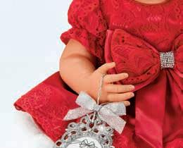 Die kleine „Gianna“ wird von Hand aus RealTouch®-Vinyl, welches zarte Babyhaut lebensecht nachemp ndet, gefertigt. Die kunstvoll gestalteten Gesichtszüge sind von Hand koloriert und jedes kleinste plastische Detail ist realistisch abgebildet. Der weiche Sto körper besitzt ein lebensnahes Gewicht und schmiegt sich angenehm in Ihre Arme. Die feinen Haare sind von Hand verwurzelt. Ihr Kopf und ihre Gliedmaßen sind beweglich, so dass Sie „Gianna“ nach Belieben in Szene setzen und das perfekte Weihnachtsfoto machen können. „Gianna“ trägt ein luxuriöses, rotes Satinkleid mit roter Spitze an der Passe und den Ärmeln sowie Spitzenbesatz an den Rocksäumen. Die überdimensionale Schleife an ihrem Kleid wird mit einem funkelnden, silbernen Kunstedelsteinbesatz geschlossen, während ihre Haarsträhnen durch ein passendes, rotes Stirnband an Ort und Stelle gehalten werden. Rote Satinschühchen und eine weiße Strumpfhose komplettieren das elegante Out t. Und natürlich darf auch ihr hübscher silberfarbener Weihnachtsschmuck mit Schmucksteinen, Metallband und Platz für ein eigenes Foto nicht fehlen. Das Accessoire kann von „Gianna“ gehalten oder an den Baum gehängt werden. Größe: 43,2 cm. Ornamentgröße: 12,7 x 8,3 cm (B x H).