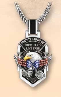 Zeigen Sie Ihre Leidenschaft für Motorräder und den American Way of Life mit diesem exklusiven Schmuckstück. Der Anhänger ist fachmännisch aus massivem Edelstahl gefertigt und zeigt in der Mitte einen Adlerkopf, einen Chopper, die US-Flagge als Schwingen und stilisierte Flammen. Sowohl der Adler als auch die Flügel heben sich durch eine farbenfrohe Handemaillierung ab, während der Satz „Don’t Tread On Me – Ride Hard – Live Free“ darüber graviert ist. Die kräftige schwarze Ionenplattierung verleiht diesem Biker-Schmuckstück den letzten Schli . Grösse Anhänger: 5 cm; Länge Halskette: 61 cm Artikel-Nr.: 01-28857-001 • CHF 89.90 (zahlbar auch in 2 Monatsraten zu je CHF 44.95) zzgl. CHF 8.95 Versand