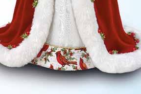 Diese wunderschöne Engelspuppe ist vollständig von Hand aus Skulpturenguss modelliert und anschliessend ligran von Hand bemalt. Das Out t besteht aus feinem Chi on und silbernem, mit Pailletten besetztem Organza. Der Engel trägt ein silbernes Bolero-Jäckchen mit Kunstfell an den Manschetten und am Kragen. Die Flügel sind mit schimmernden Kunstfedern nachgebildet, und an einer Hand baumeln zwei silberne Glöckchen, die läuten und mit einer schillernden Schleife zusammengebunden sind. Im luxuriösen Rock sind LED-Lichtern integriert, die stimmungsvolles Licht verströmen. Auf Knopfdruck erklingt die Melodie von „Carol of the Bells“. Grösse: 61 cm Artikel-Nr.: 03-03146-001 • CHF 249.90 (zahlbar auch in 5 Monatsraten zu je CHF 49.98) zzgl. CHF 14.90 Versand Benötigt 3 „AA“-Batterien (nicht im Lieferumfang enthalten)