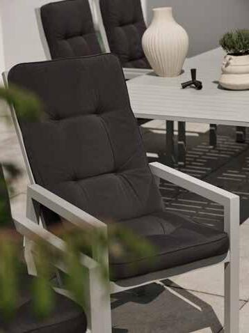 Classic design inspired by a timeless aesthetic and the unmistakable mood of the archipelago. White aluminium group with beautifully designed features like a cross in the backrest, tapered legs and olefin fabric. The cushions are designed with extra support at the back. The tables have embossed aluminium ribs on the top.