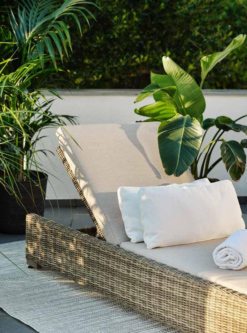 Soffgrupp i konstrotting med generöst djup och dynor i olefintyg – här sitter du skönt och ombonat under sommarens alla timmar. Extra kuddar ingår; använd dem som armstöd, bakom ryggen eller under huvudet när du sträcker ut dig med en bok – oavsett kommer de bidra med extra komfort till en redan bekväm stund.