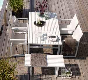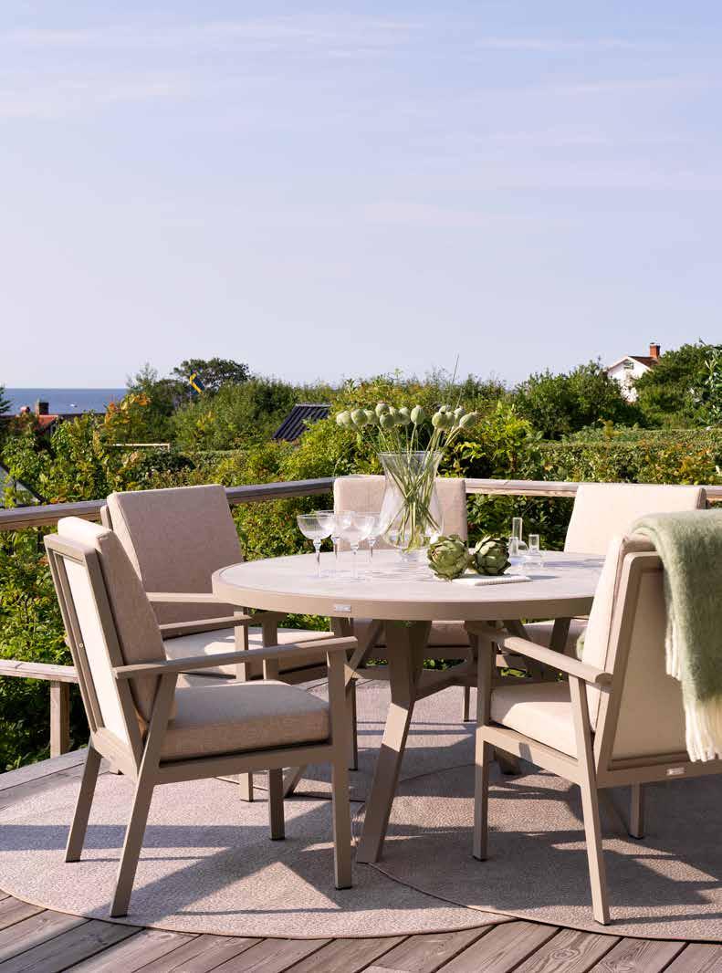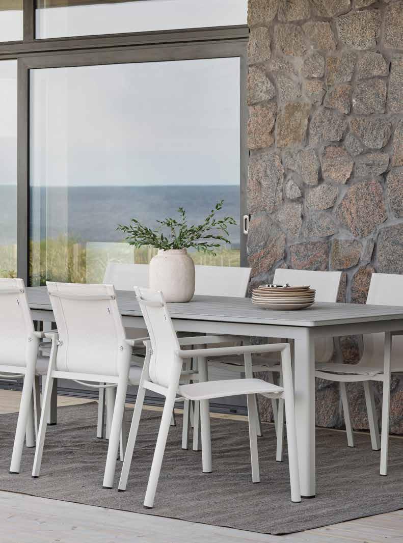 Klassisk design inspirerad av ett tidlöst formspråk och en tydlig skärgårdskänsla. En vit aluminiumgrupp med vackert formade detaljer som kryss i ryggen, avsmalnande ben och dynor i olefintyg. Dynorna är formade med extra stöd i ryggen. Borden har präglade aluminiumlameller på toppen.