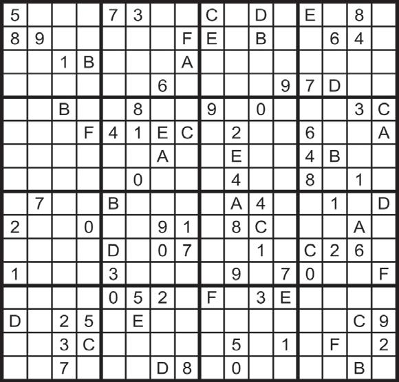Fill in the grid so that every row, every column, and every 4x4 box contains the digits 1 through 9. AND the letters A through F. Solution below