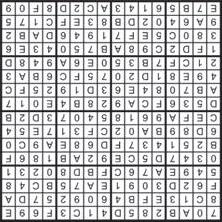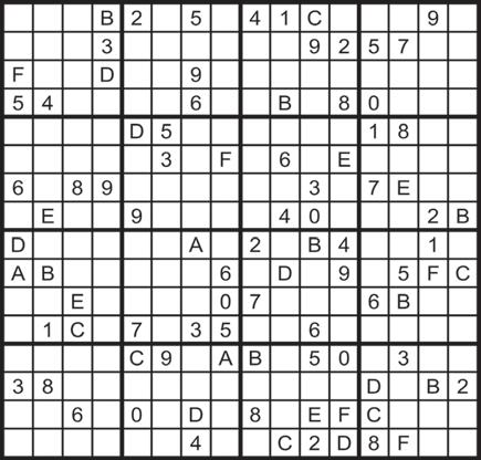 Fill in the grid so that every row, every column, and every 4x4 box contains the digits 1 through 9. AND the letters A through F. Solution below
