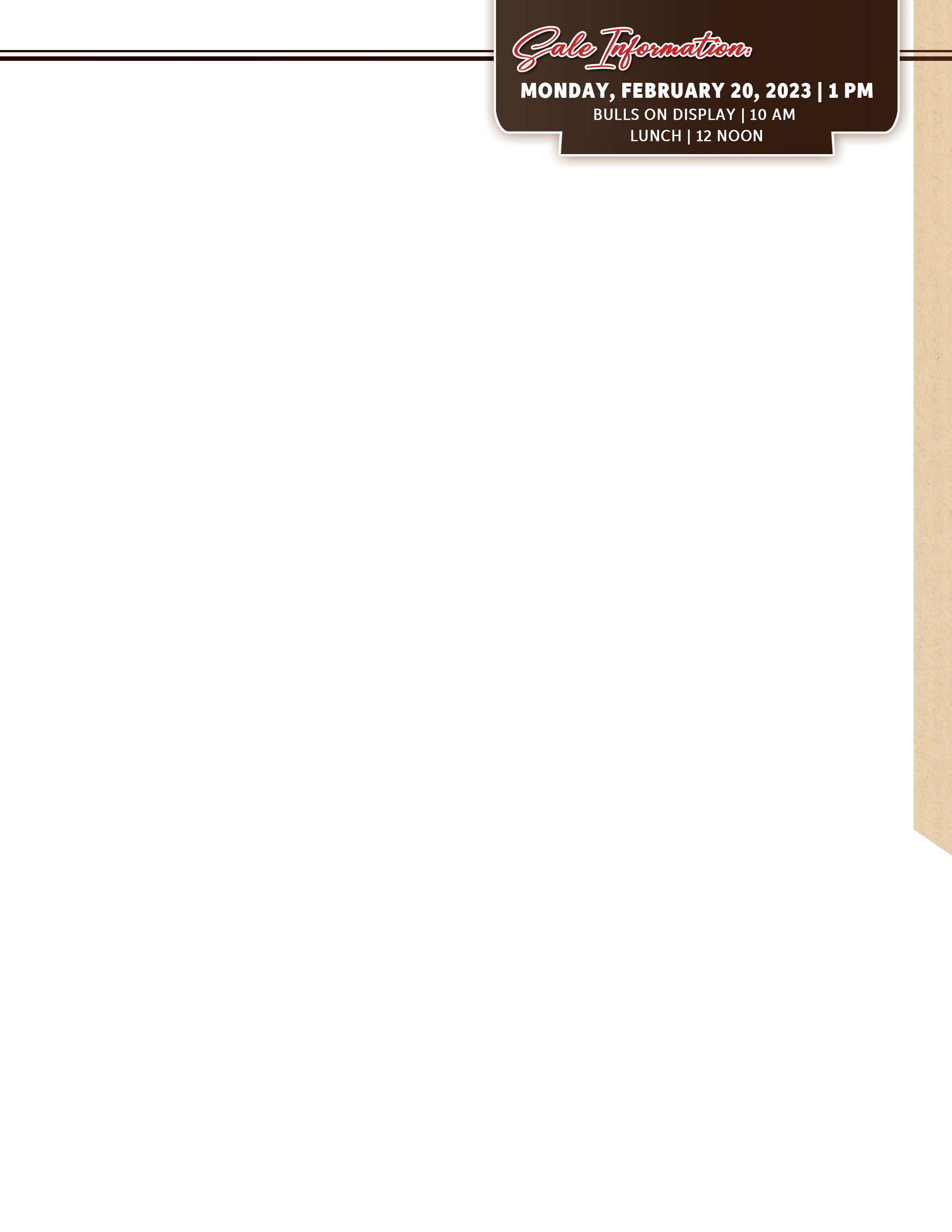 All cattle will sell on large screen monitors. Cattle will not come into the sale ring during the auction. Please make plans to arrive early and preview the sale offering in the pens. If you wish to preview the bulls prior to sale, please call in advance to arrange your visit.