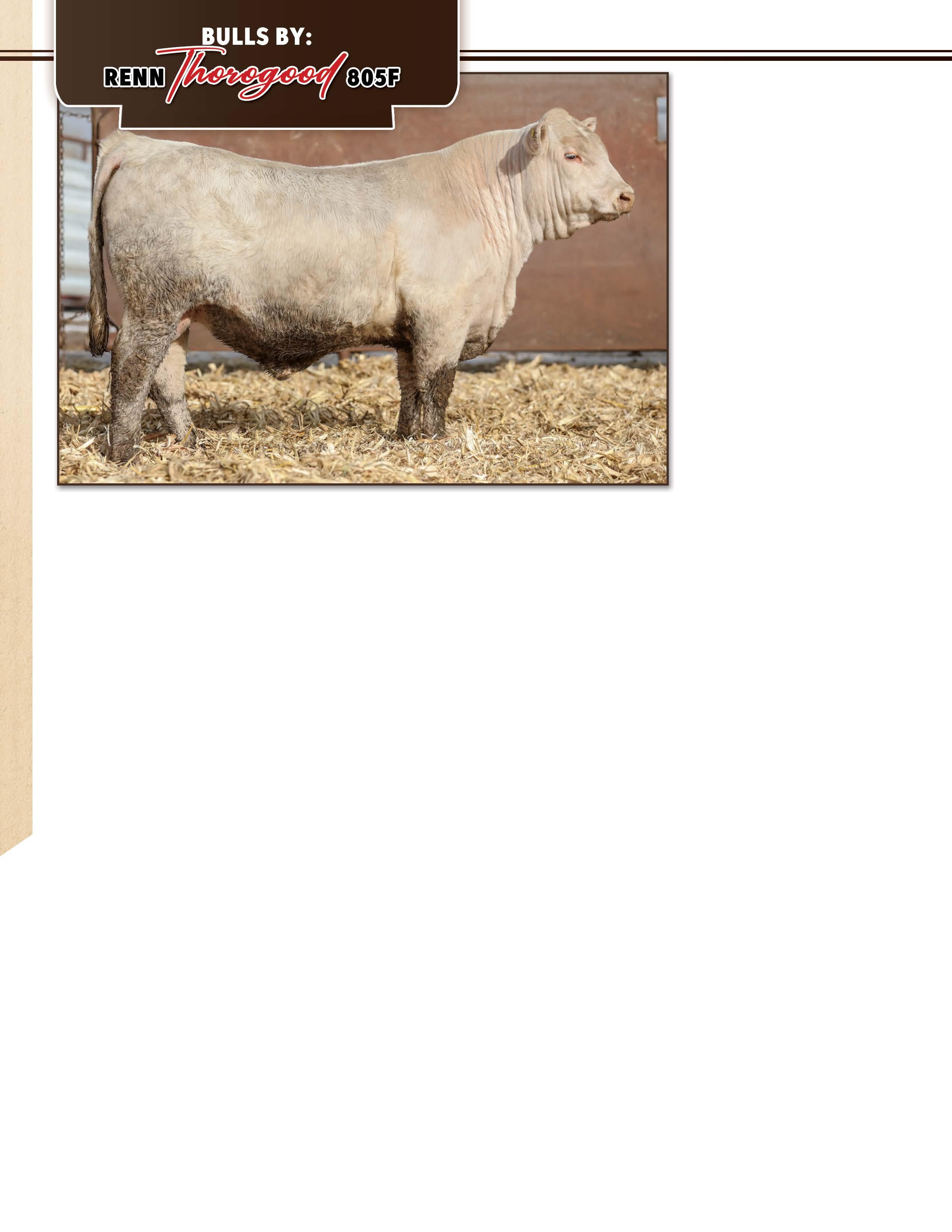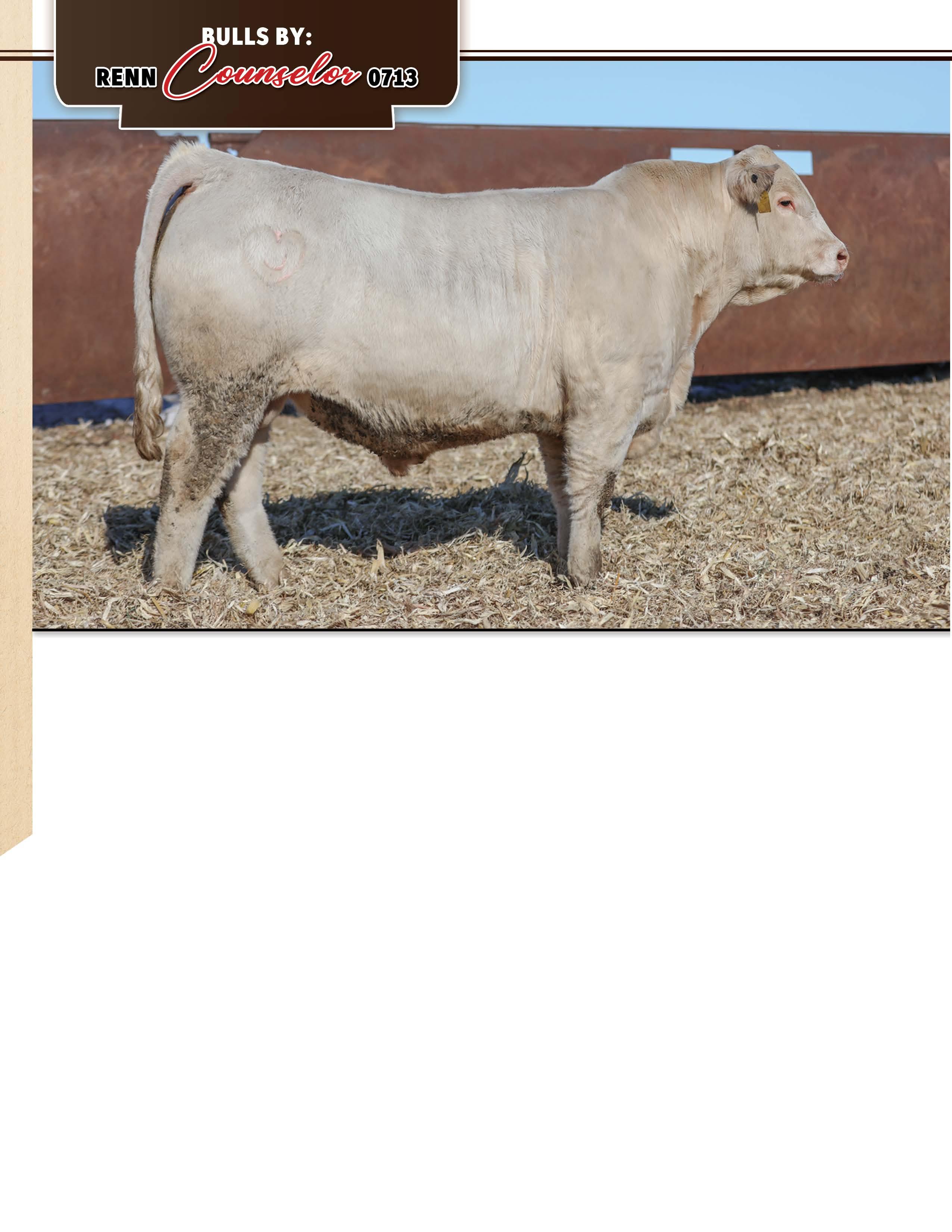 — This is an outstanding performance Charolais bull here! He has one of the largest weaning weights on the sale at 855 lbs that ratio’d 108 and a Yearling Weight of 1484 to ratio 115. He was gaining an outstanding 5.526 lbs/day on test and closed out at 4.2 lbs/day ranking amongst the best of the best. He is a stout made, heavy muscled bull with lots of volume who stands square on all four corners. He is out of one of our donor females and sired by RENN Lexington 6346, who was our high-selling bull on our very first POTP Bull Sale. If you are a seedstock breeder or a commercial cattleman who finishes out your own cattle, this is one bull you will have to add to your bull battery.