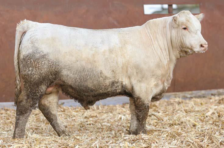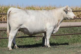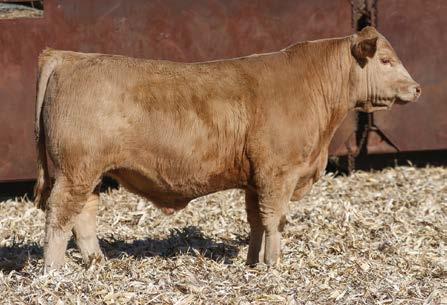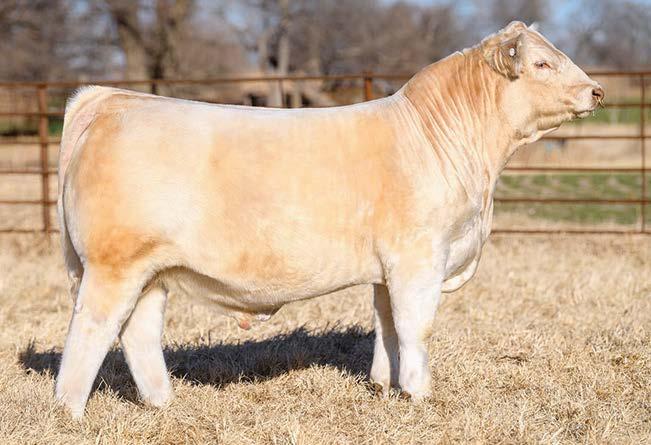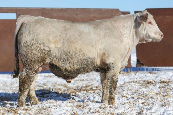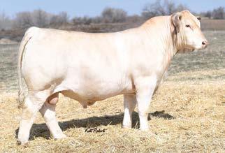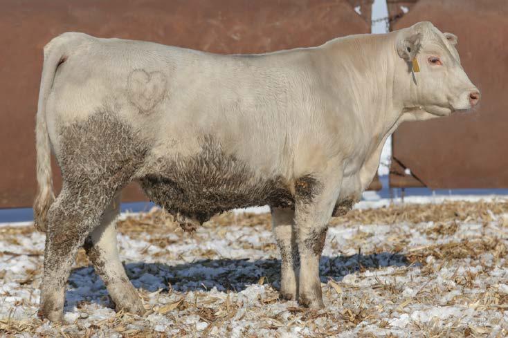 — Here is a virgin bull who has not been offered for sale. He has a strong weaning weight of 732 to ratio 111. He is a nice ¾ blood Charolais out of a gorgeous 50% Charolais, 50% Angus female. This bull is well put together and has a lot of shape. If you need to add some heterosis in your calf crop, this is the bull for you.