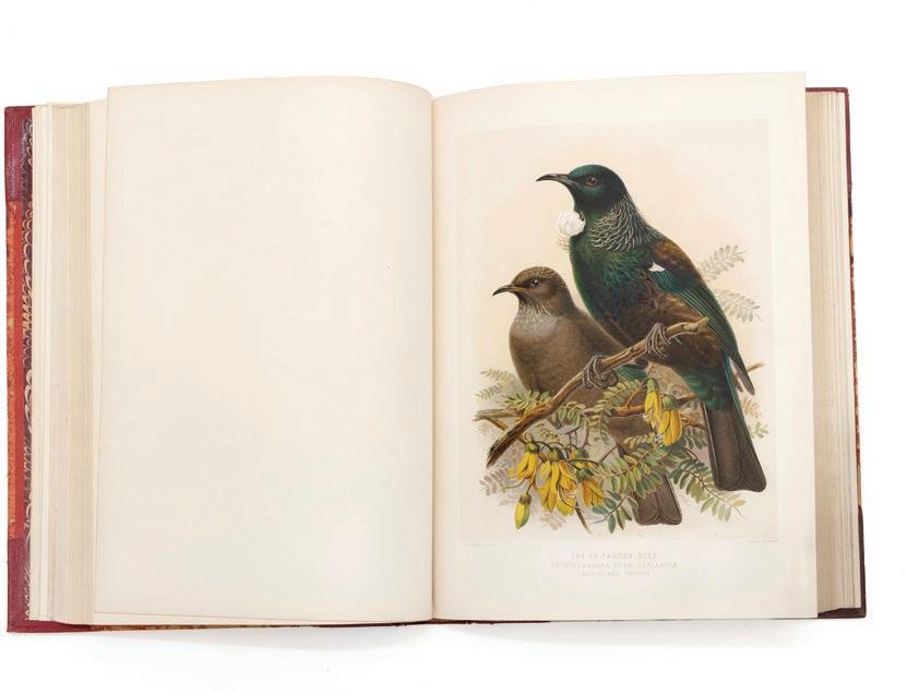 Its Physical Geography, Geology And Natural History With Special Reference To The Results Of Government Expeditions In The Provinces Of Auckland And Nelson. J. G. Gotta, Stuttgart, first edition, 1867, illus including coloured frontis of a Maori Chief, some plates with original tissue guards, original blind stamped green cloth with oval gilt illustration to cover, spine crudely taped, general foxing throughout, else G $200 - $350