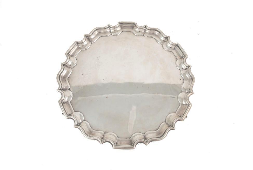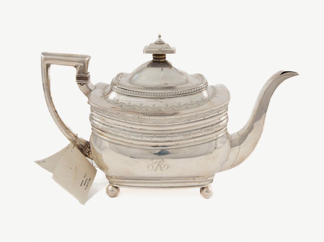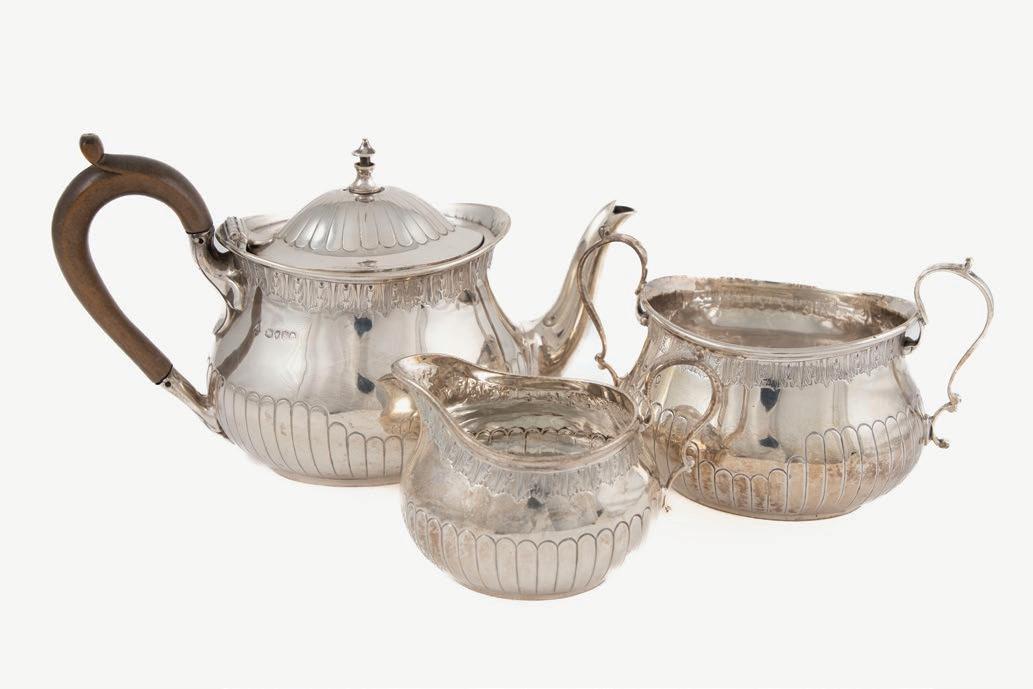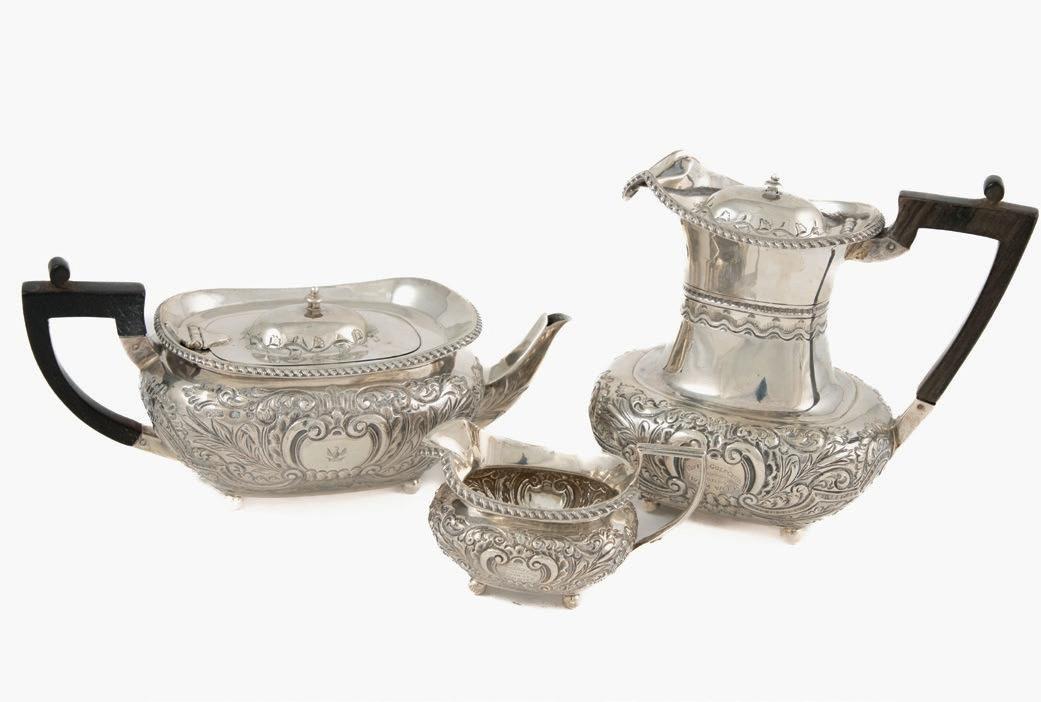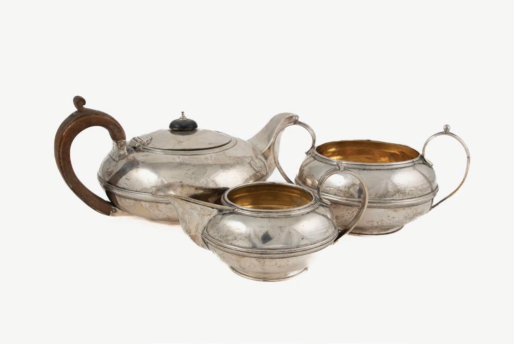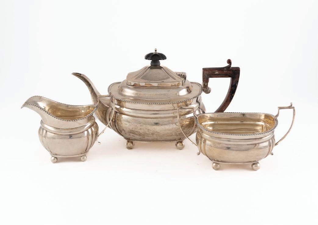 Geo V S/S 3 Piece Batchelors Teaset circular shape on leaf cast scroll legs, engraved initials, Birmingham 1919, approx 635 grams