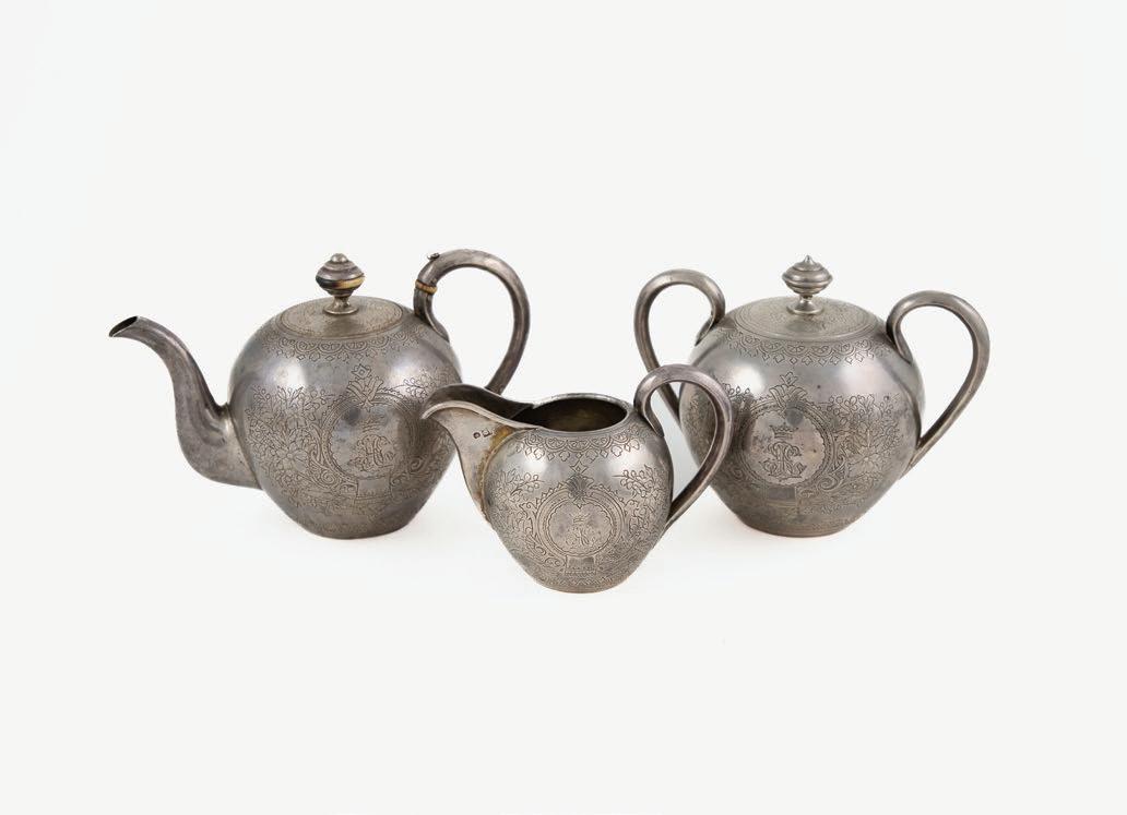 Vict S/S 3 Piece Teaset baluster shape, pot lid with bird finial, embossed floral and scroll decoration and cartouche with engraved initials, Sheffield 1867, maker Martin Hall & Co, approx 1676 grams