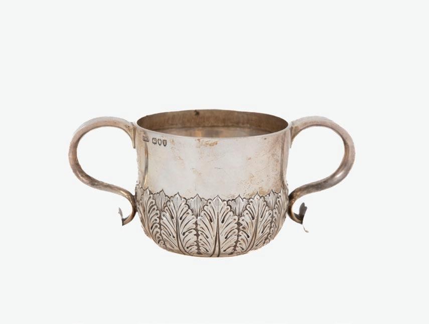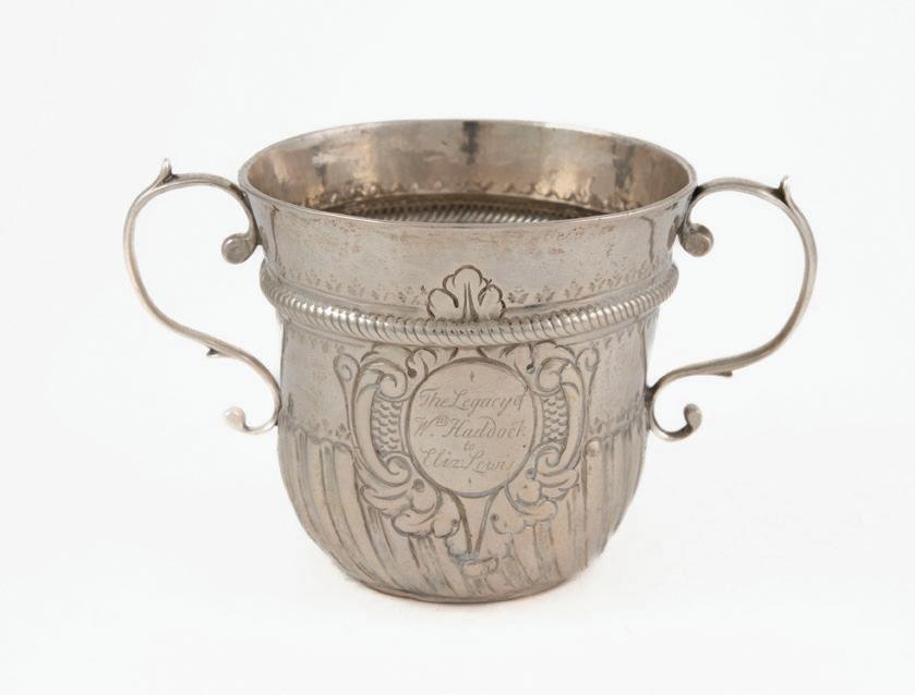 Geo II S/S Porringer Or Caudle Cup traditional two handled form, gadrooned band, part fluted below with embossed scrolls and engraved marriage cartouche, London 1726, makers mark worn.