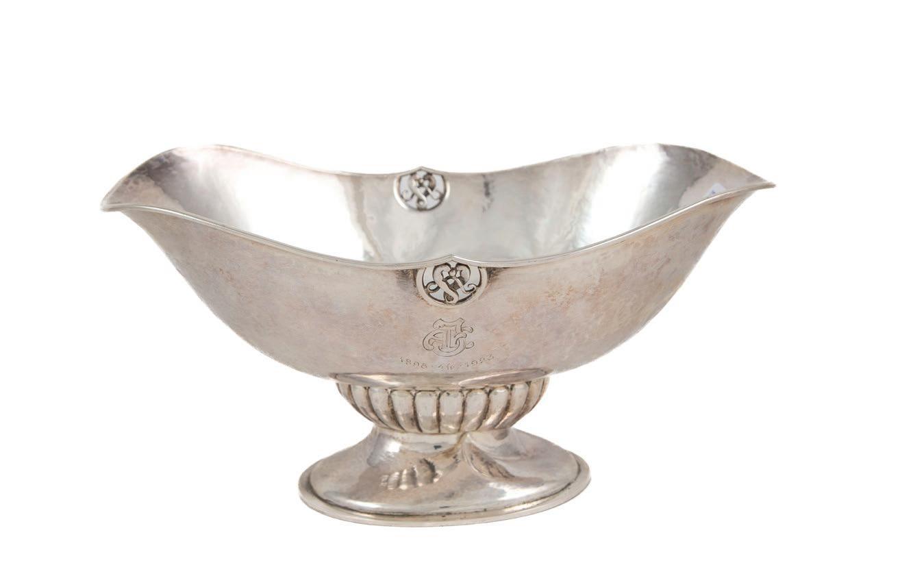 Geo V S/S Gravy Boat By Walker & Hall fluted rim and handle, engraved crest on stylised scroll legs, Sheffield 1924, approx 204 grams