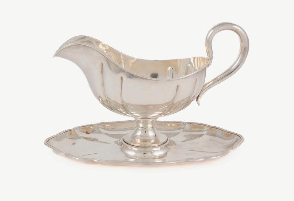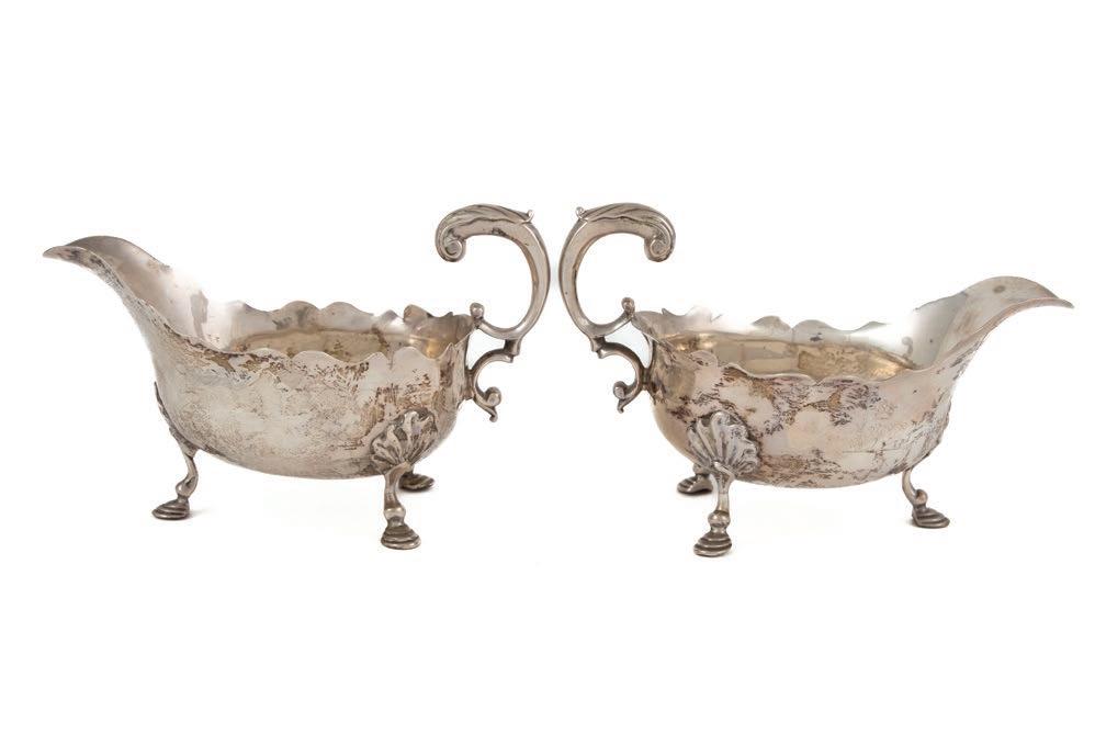 Geo III S/S Gravy Boat with gadrooned rim, acanthus top scroll handle on shell top legs with hoof feet, London 1765, makers David Hennel I & Robert Hennel I, approx 124 grams