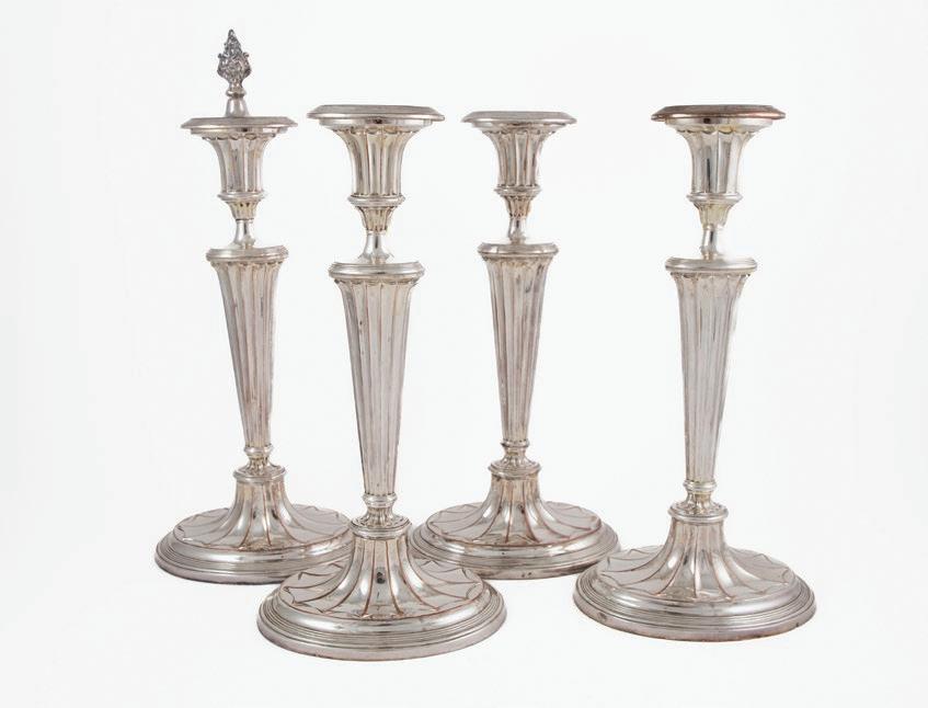 Set Of 4 C19th Sheffield Plate Table Candlesticks neo-classical design, detachable oval nozzles, fluted tapering columns, oval bases (loaded), one with detachable floral finial