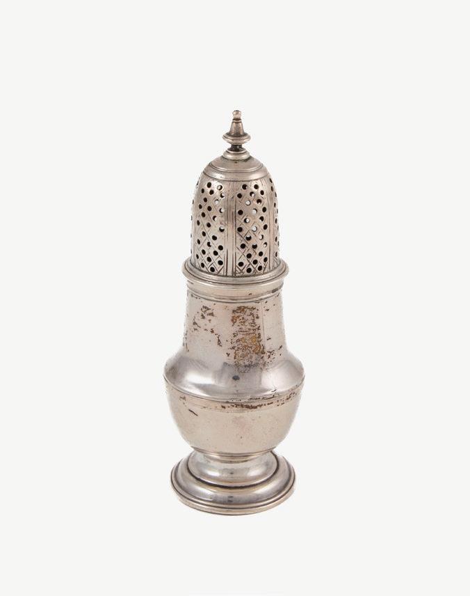 Geo II S/S Sugar Caster traditional footed baluster form, the pierced dome lid with urn finial, London 1757, maker Jabez Daniell