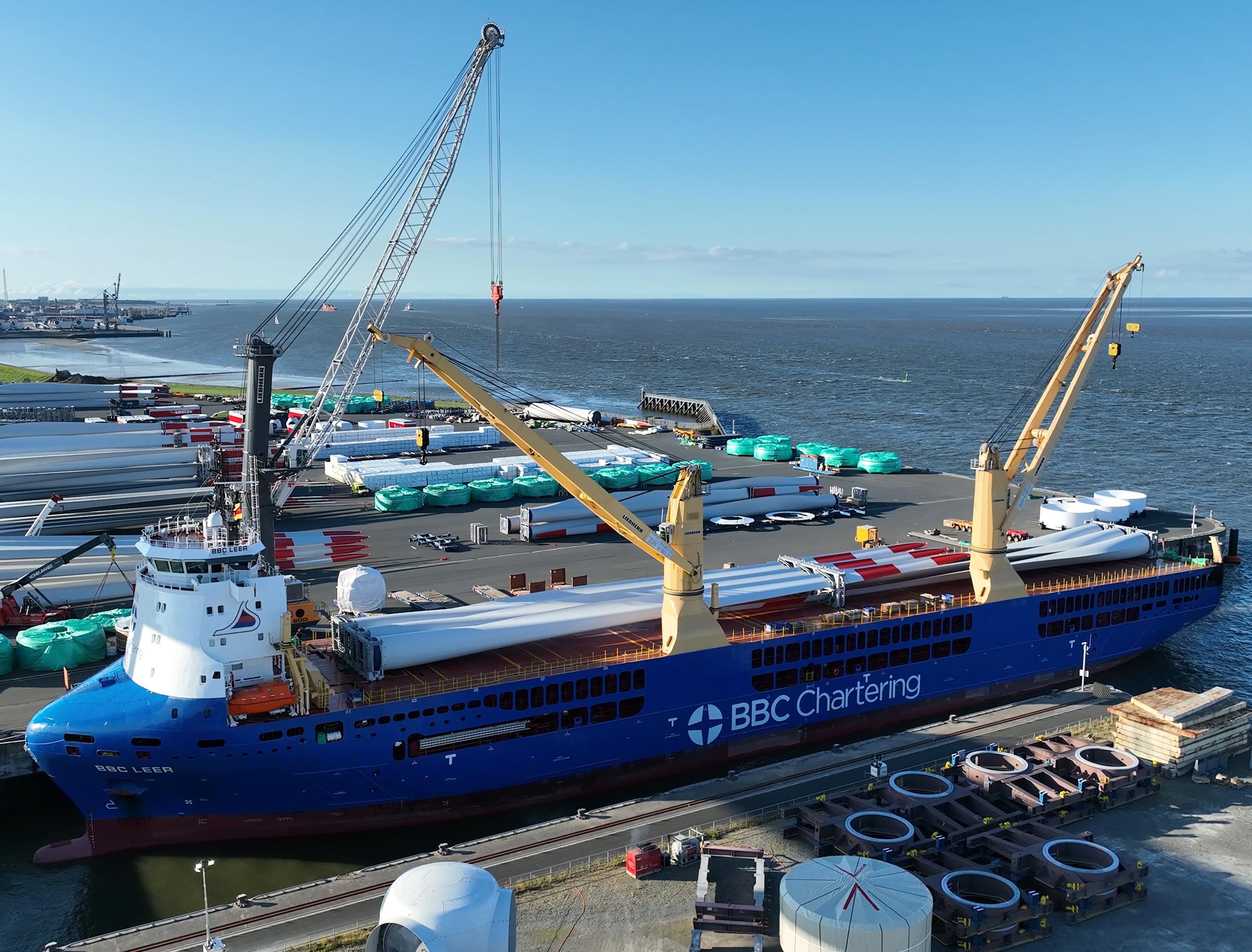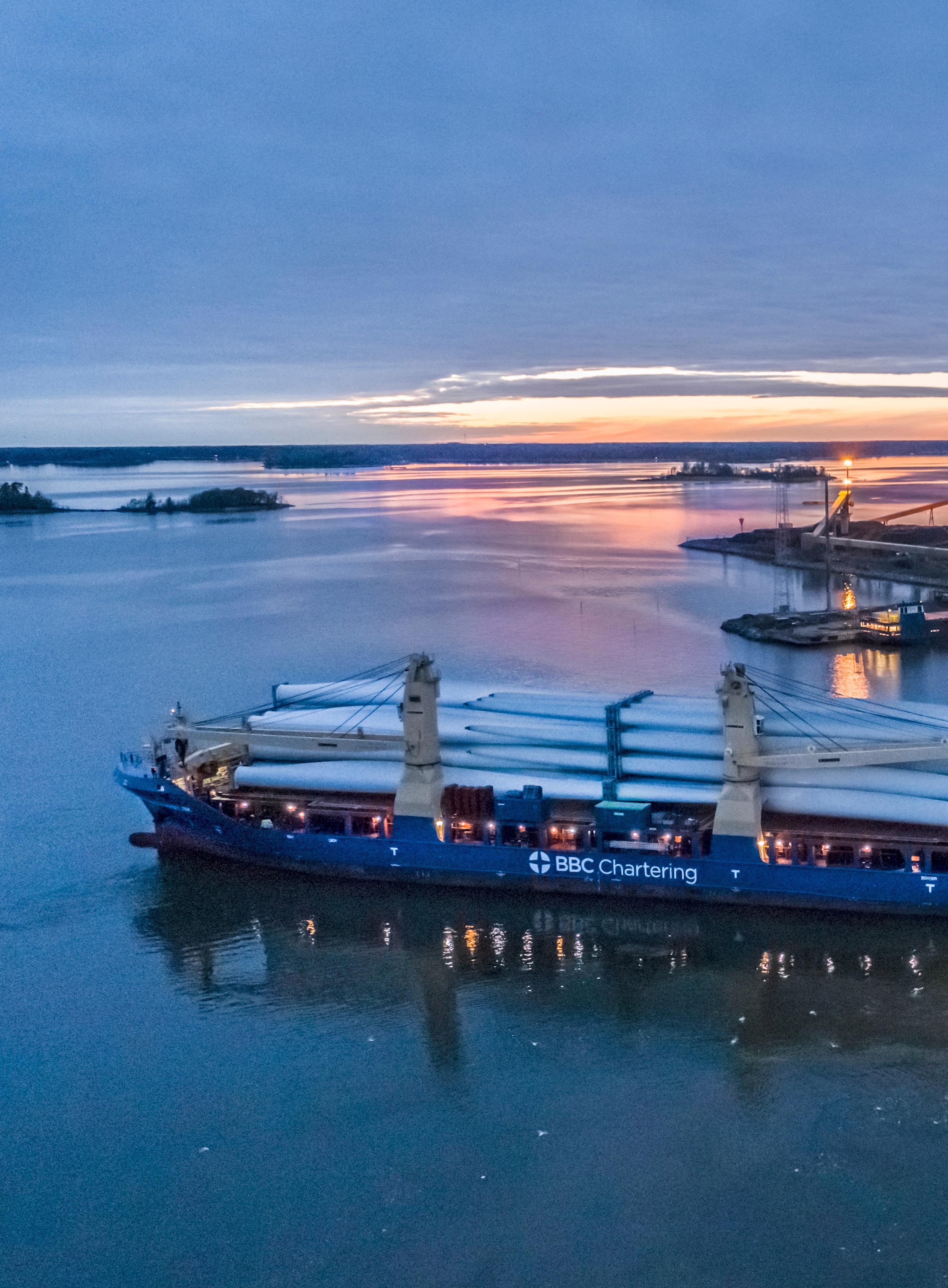 The BBC Arkhangelsk transports a full deck of wind blades in Vaasa, Finland.