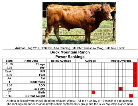 ◆ His sire is Shigemaru and his dam is the second highest IMF score by live ultrasound in the Buck Mountain herd.