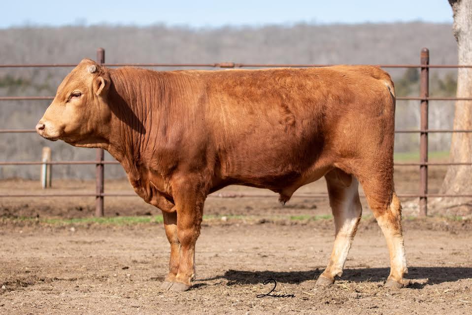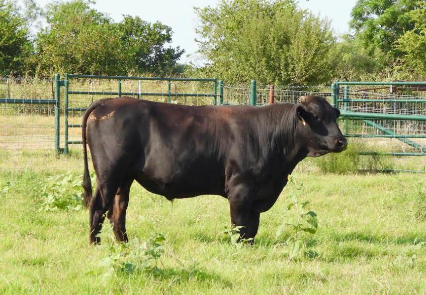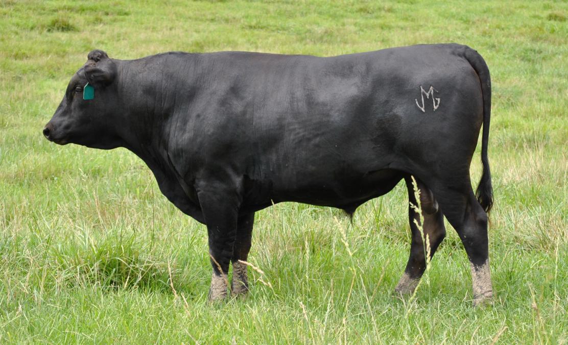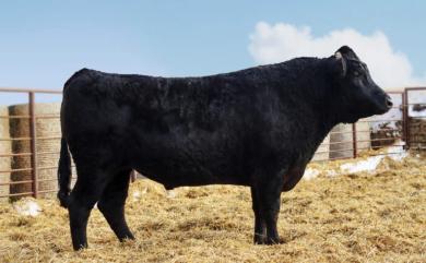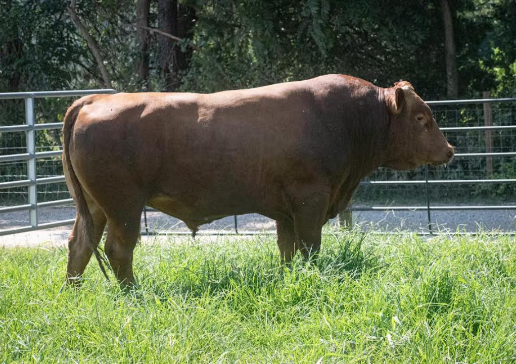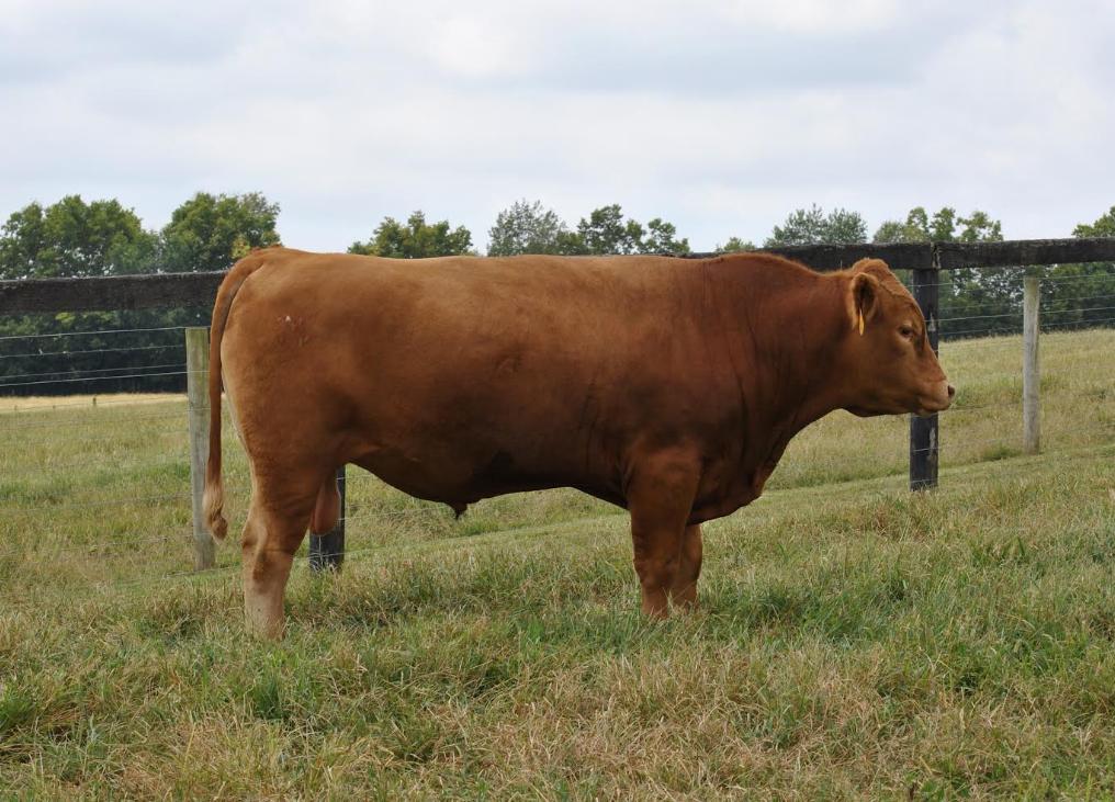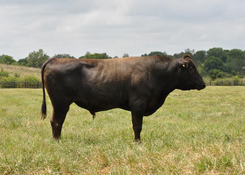 ◆ He carries a high 2.56 pounds of gain (ADG) making him very feed efficient and a FCR of 7.38. He also carries a larger than average ribeye for a 400-day live scan and weighed in at 774 pounds at 400 days. He is a well-balanced bull that will make feed efficient calves.
