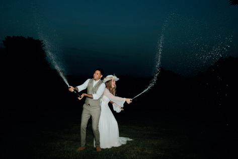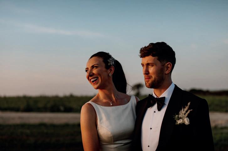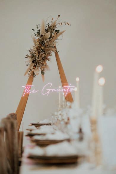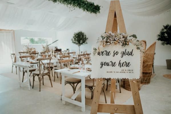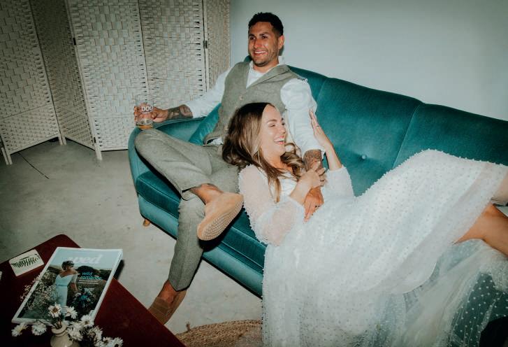 Dressed with pampas grass, festoon lights and drapes, the venue’s Really Rustic Barn made an atmospheric setting for the ceremony, which began with a stirring performance of Elvis Presley’s Can’t Help Falling In Love by The Swing Kings as Hollie walked down the aisle. After the vows and a poem read by their celebrant, the newlyweds exited to another classic: Stevie Wonder’s Signed, Sealed, Delivered.