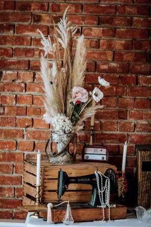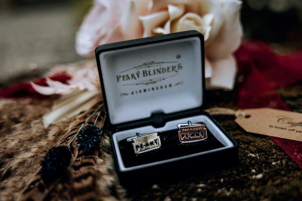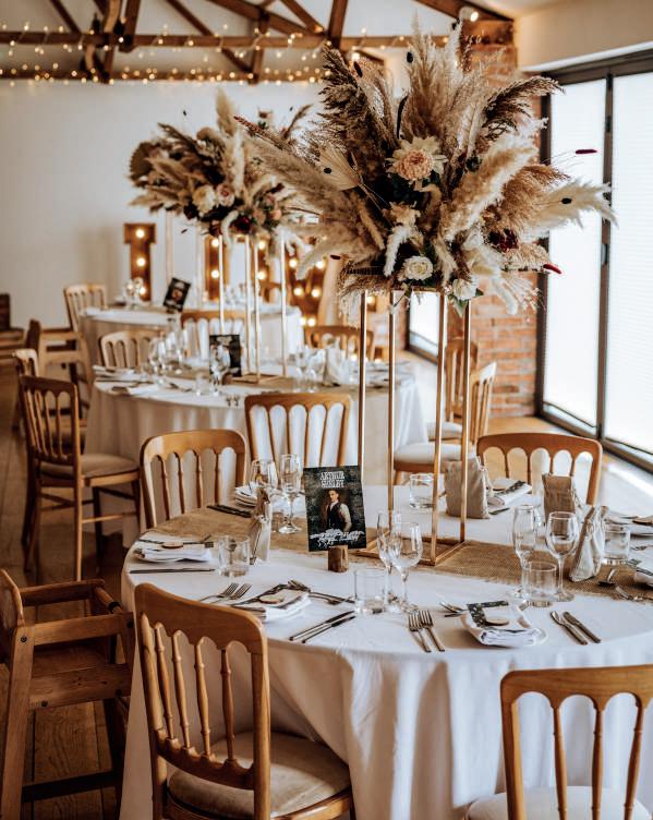 The Green had been earmarked years before as their venue of choice, serving as the most picturesque backdrop to their Peaky Blinders themed day. “This was chosen due to Thomas’ love of the show and our love of the vintage style theme,” says Hollie. A colour scheme of burgundy, gold and navy blue punctuated with pampas grass beautifully carried the look. “I also added dusky pink to lighten the theme due to the darkness of our other colours,” she explains. As well as their guests dressing in 1920s’ style, a smattering of décor and props including whiskey barrels, vintage suitcases and vintage candlestick holders enhanced the scene, while the floristry pulled all the details together.